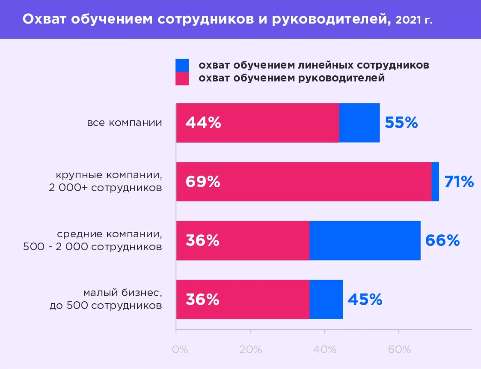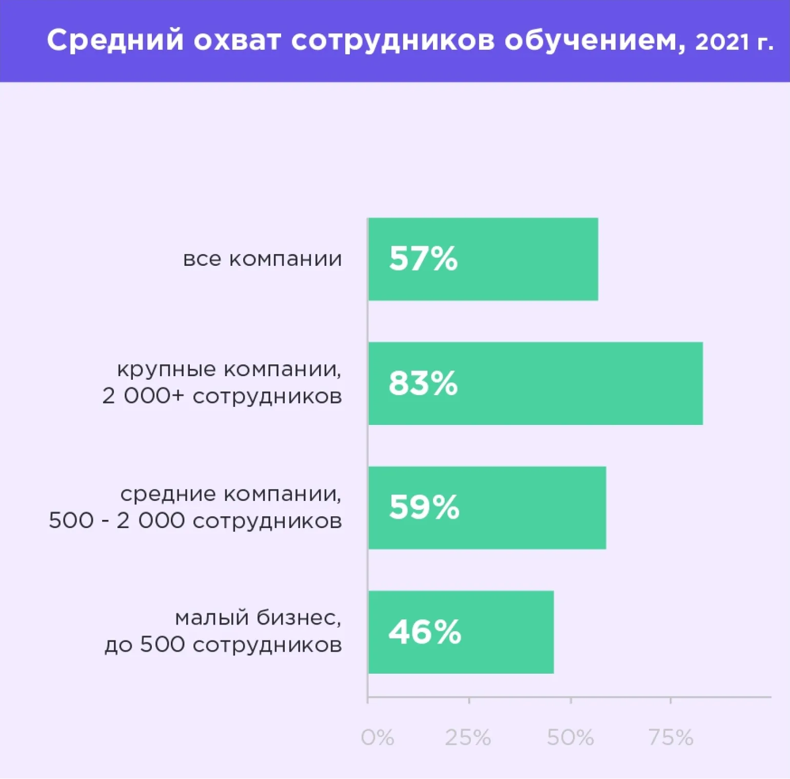 Данные показывают: чем крупнее компания, тем большая доля её сотрудников охвачена обучением. В крупном бизнесе в 2021 году учились 83% персонала, для среднего и малого бизнеса охваты значительно меньше — 59% и 46% соответственно.