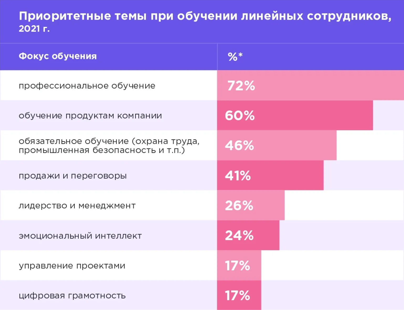 Большинство опрошенных компаний (72%) фокусируются на обучении линейных сотрудников профессиональным компетенциям. Также 60% организаций проводят обучение по продуктам компании и чуть меньше половины (46%) обучают таким темам, как охрана труда и промышленная безопасность.