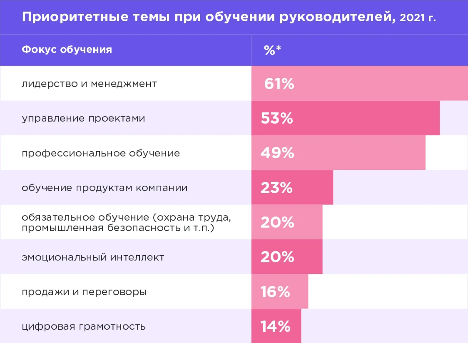Результаты исследования 2021 года показали вполне типичные для руководителей направления обучения. В основном это лидерство и менеджмент. На втором месте — управление проектами, на третьем — профессиональное обучение.