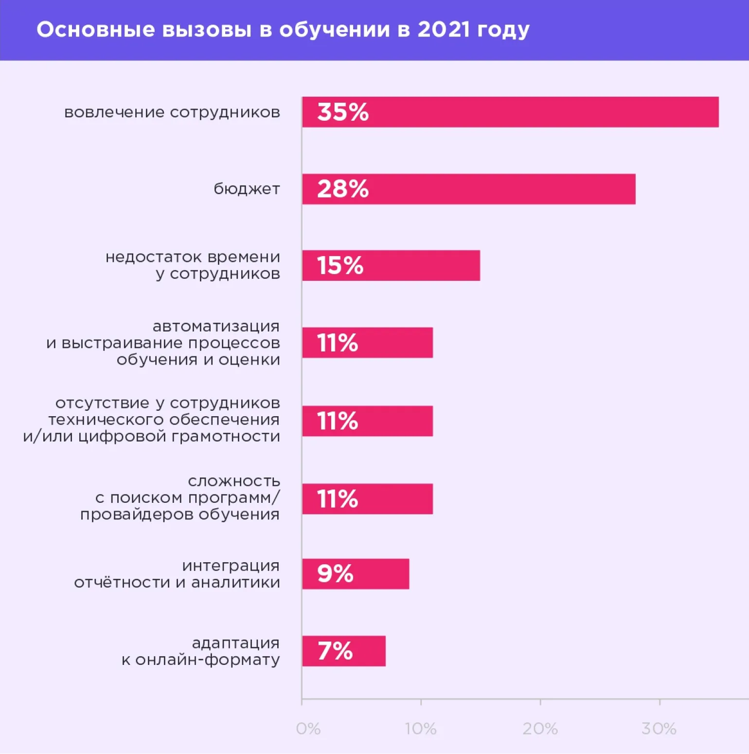 О том, что вовлечение стало ключевой проблемой корпоративного обучения в 2021 году, сообщили 35% опрошенных представителей компаний. По данным авторов отчёта, такая проблема возникает в основном с рядовыми сотрудниками и наиболее заметна она в сегментах среднего и крупного бизнеса.