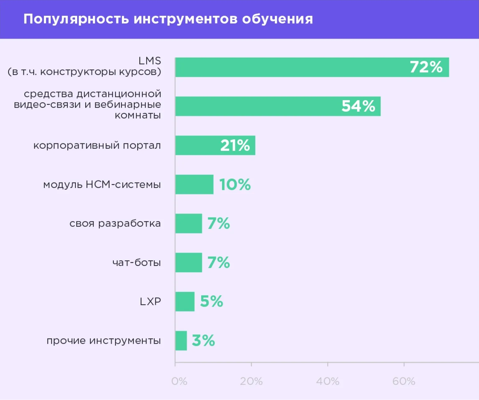 Самым популярным инструментом среди участников опроса предсказуемо стали LMS. Вероятно, связано это с тем, что туда можно загрузить и собственные курсы, и подтянуть арендованный контент — это лишний раз подтверждает актуальность внутреннего обучения.