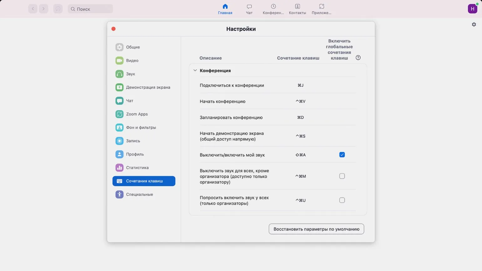 «Пробел» работает, только если окно Zoom открыто, однако можно использовать управление клавишами и при свёрнутой программе. Чтобы активировать эту возможность, в десктопной версии нажмите на иконку профиля, а затем выберите «Настройки».
