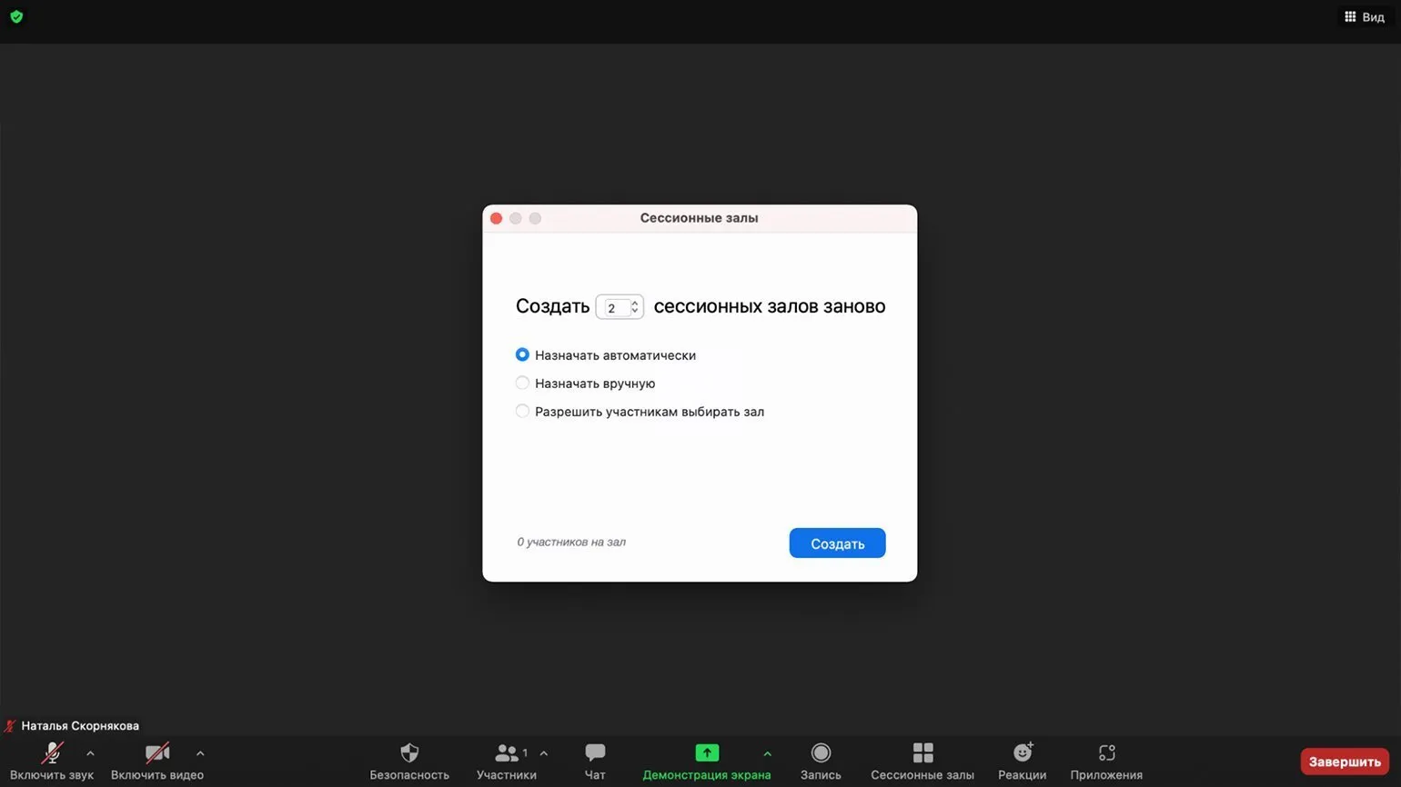 Также теперь вы сможете открывать сессионные залы прямо во время конференции — на нижней панели появится соответствующая кнопка. Здесь настраивается количество групп, а также способ распределения участников: вручную организатором, автоматически или по собственному желанию пользователей. Сам организатор может заходить в любые группы, а также в любой момент перемещать участников из одного зала в другой.