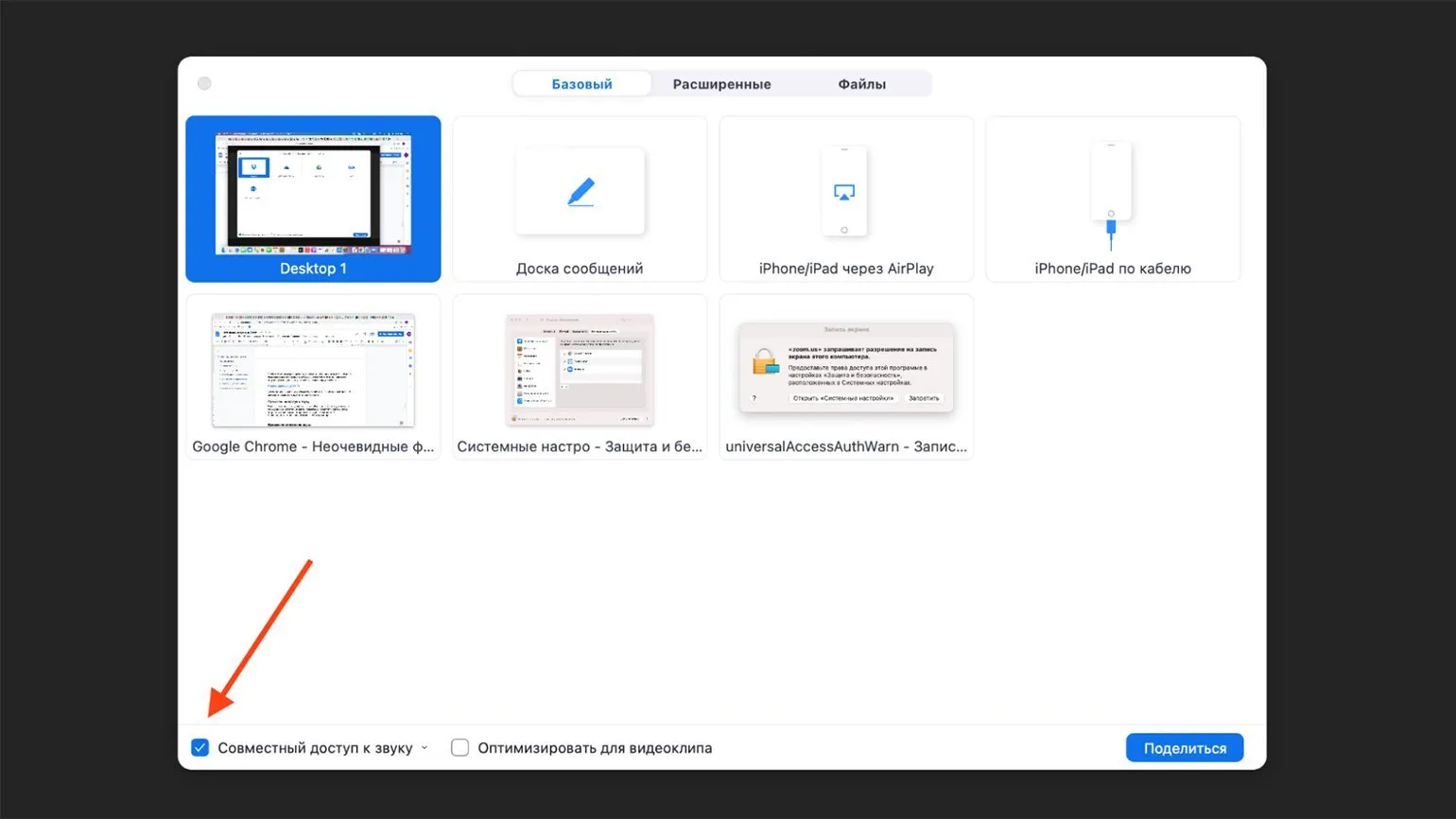 Если вы хотите показать участникам конференции какое-нибудь видео, а потом устроить его обсуждение, необязательно ждать, пока каждый посмотрит ролик на своём устройстве. Zoom позволяет организовать удобный совместный онлайн-просмотр с трансляцией звука вашего компьютера. Для этого, как обычно, нажмите на кнопку «Демонстрация экрана», только теперь поставьте галочку возле пункта «Совместный доступ к звуку».