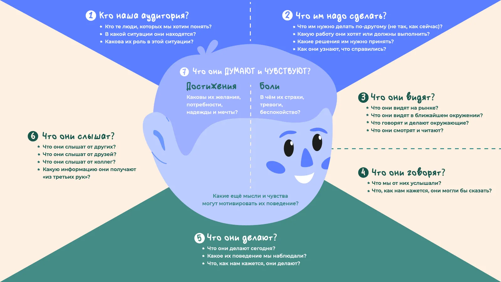 Карта эмпатии — визуальный инструмент, помогающий собрать результаты исследований аудитории, проанализировать их и лучше понять своих пользователей. Его часто используют маркетологи и разработчики. Карту эмпатии придумал Дейв Грей — основатель консалтинговой компании XPLANE, автор книг по дизайну и визуальному мышлению. В интернете можно найти много вариантов этой карты, разные компании меняют пункты карты под себя. Дейв Грей последний раз обновлял свою карту в 2017 году, она состоит из семи блоков.