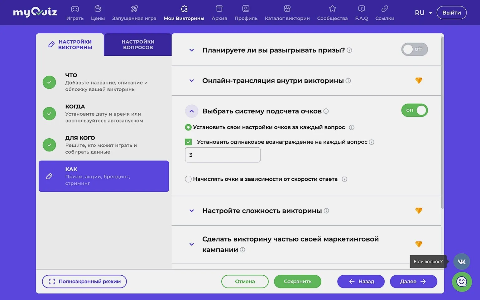 На первой вкладке «Настройки викторины» находятся четыре подраздела: «Что», «Когда», «Для кого», «Как».