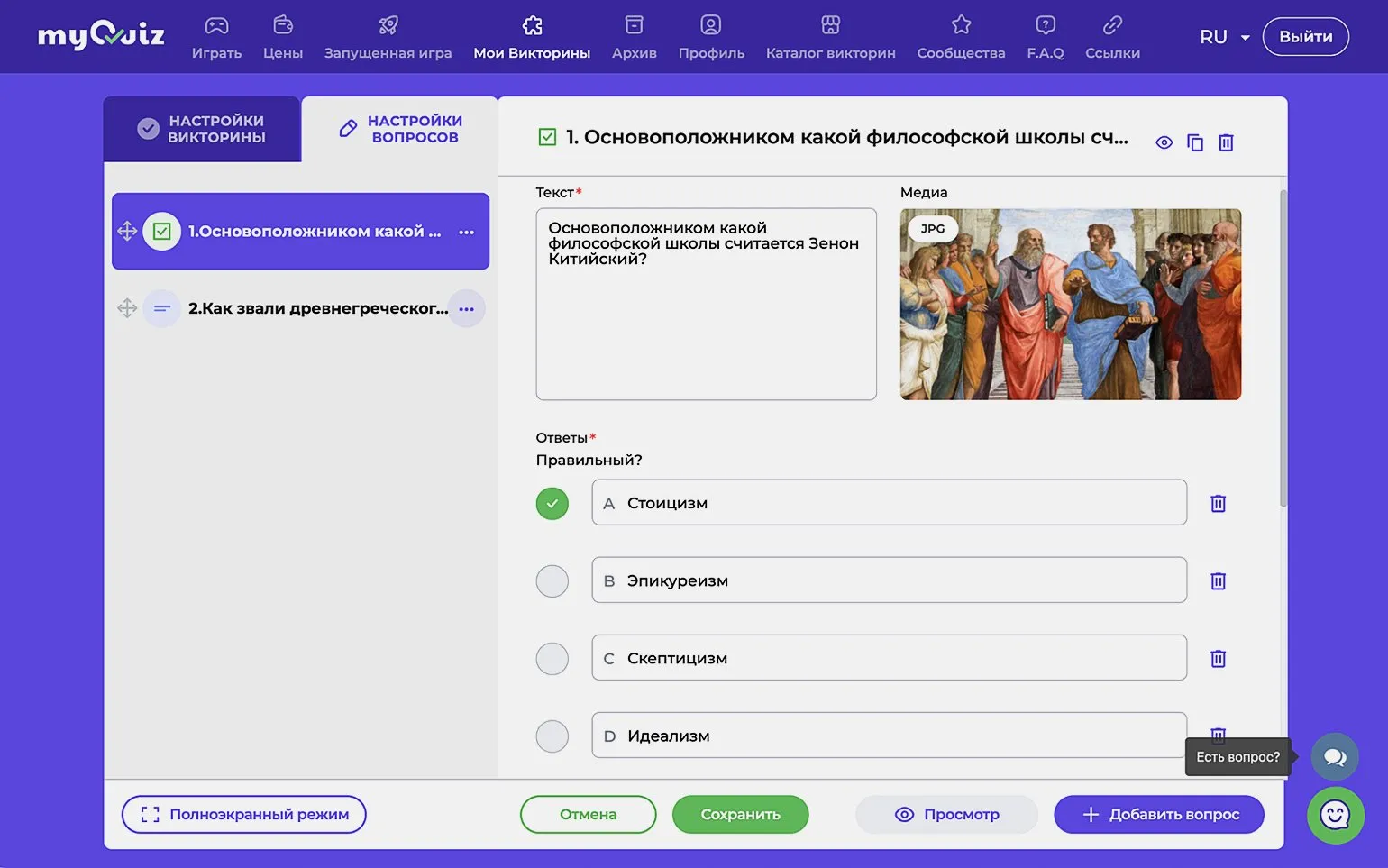 Чтобы увидеть все вопросы на одном экране, нажмите на кнопку «Просмотр» внизу страницы. Это поможет быстро проверить, везде ли прикреплены верные изображения, правильно ли отмечены ответы, настроено время и так далее.