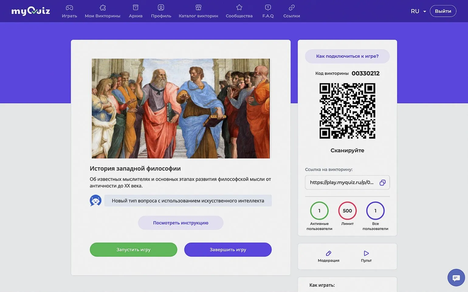 Когда участники собрались и вы готовы начать, можно нажимать на кнопку «Запустить игру». После этого вы сможете наблюдать за появлением вопросов и контролировать процесс тремя кнопками: