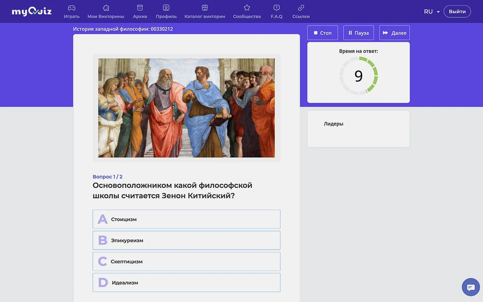 - «Пауза» приостанавливает процесс — время, установленное для ответов, не будет истекать, пока вы не нажмёте на кнопку «Играть».