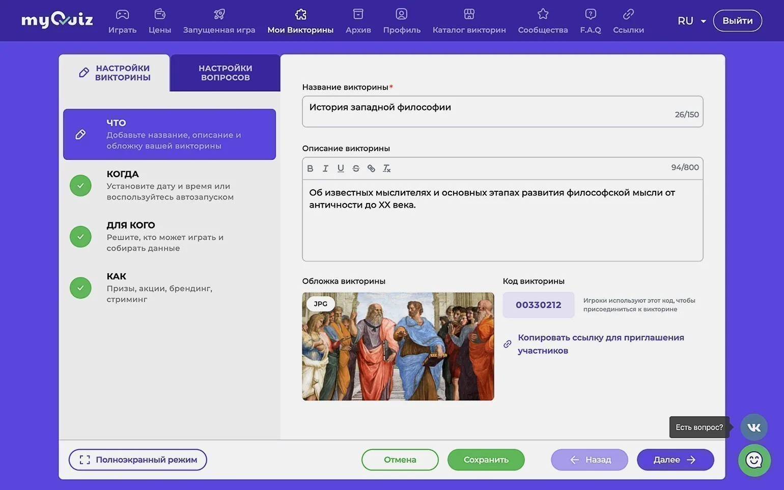 После создания вопросов тест готов к запуску, пора приглашать участников. Напомним, что нужно открыть вкладку «Настройки викторины», выбрать «Что» и скопировать пригласительную ссылку. Или получить там же цифровой код, который игроки могут ввести на странице play.myquiz.ru/.