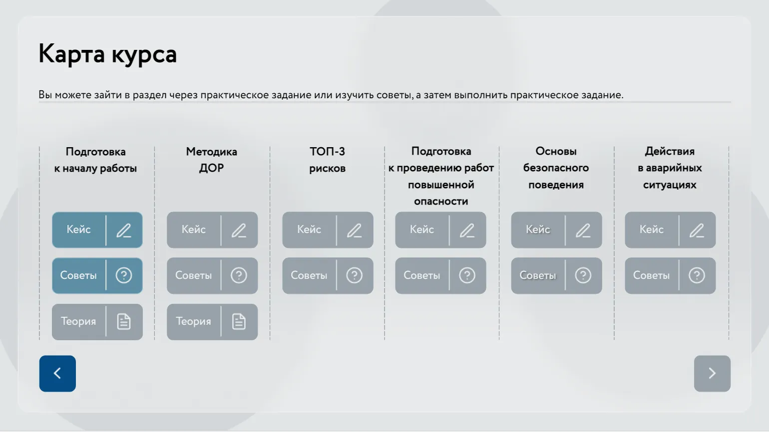 Это карта курса, которая подстраивается под потребности и особенности слушателя и даёт ему возможность изучать разделы, необходимые именно ему. Например, в корпоративном курсе «Адаптация после длительного отсутствия», который проходят сотрудники НЛМК после длительных отпусков, в начале каждого раздела слушателю предлагалось пройти небольшой кейс на знание правил безопасности. В зависимости от результатов прохождения кейса на карте курса появляются обязательные и дополнительные материалы для изучения.