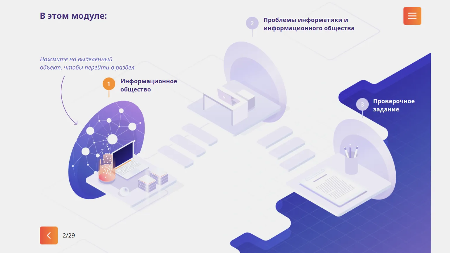 • Помогает ориентироваться в виртуальном пространстве курса.