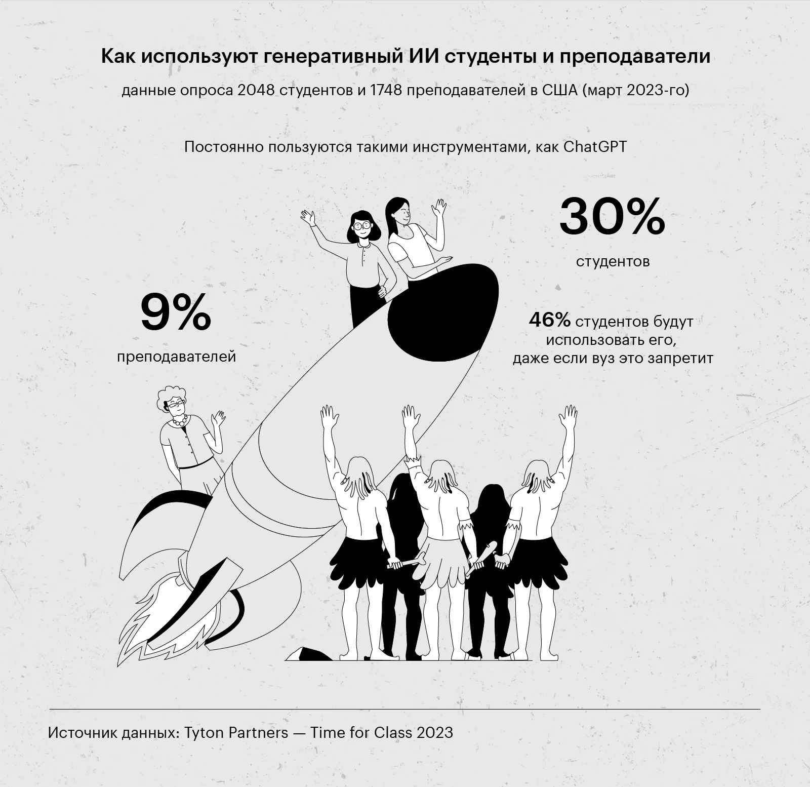 Это подтверждает исследование Time for Class 2023 от ведущей англо-американской консалтинговой компании в области глобального образования Tyton Partners. Она провела его в партнёрстве с рядом других организаций (в числе которых Фонд Билла и Мелинды Гейтс). Данные для этого исследования собраны весной 2023 года в трёх опросах с участием 2048 студентов, 1748 преподавателей и 306 администраторов вузов. Аналитики выяснили, что студенты и преподаватели внедряют текстовые инструменты на основе генеративного ИИ (вроде ChatGPT) в свою практику с разной скоростью — студенты идут с опережением на 20%. Вроде бы разница не слишком драматичная, но всё же заметная.