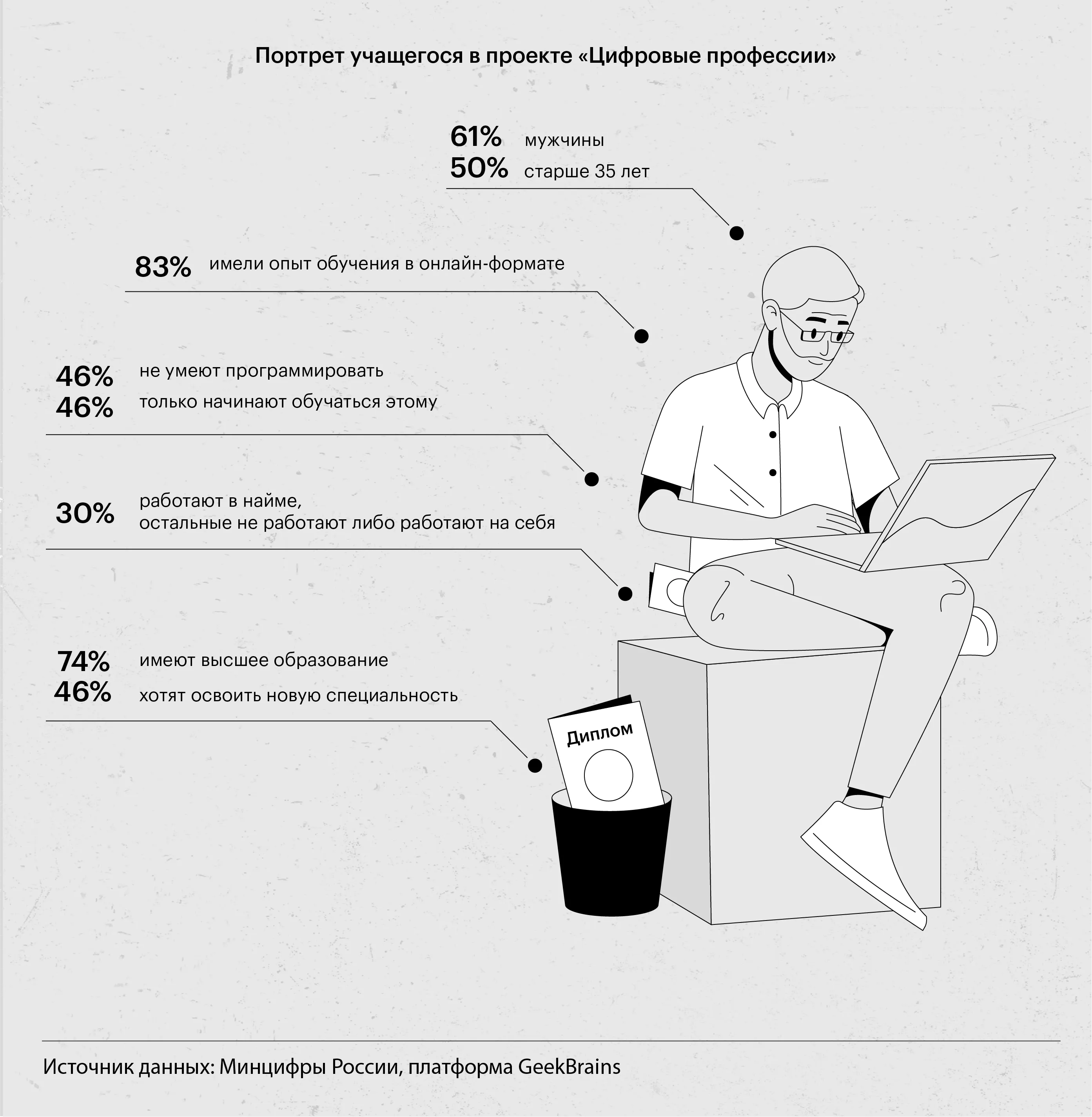 Данные об участниках этой льготной образовательной программы обобщили Минцифры России и платформа GeekBrains.