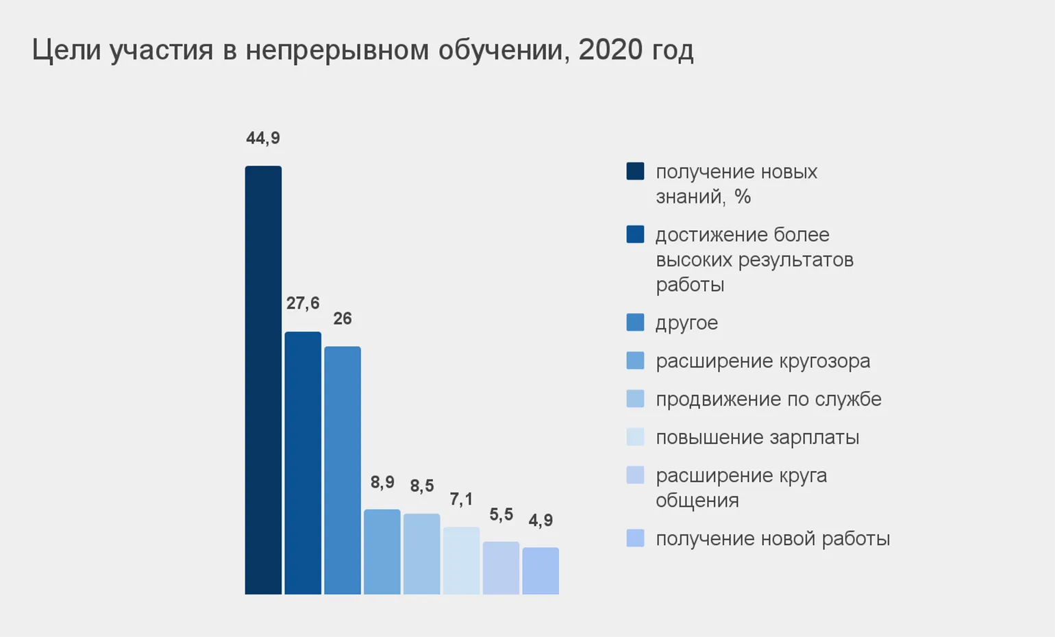 Это не значит, что люди идут учиться только вынужденно, по необходимости. Да, в корпоративном секторе темы курсов, как правило, задаёт работодатель, но в целом данные опросов не позволяют точно сказать, в каких случаях человек пошёл на учёбу по распоряжению начальства, а в каких руководствовался собственными профессиональными амбициями. В любом случае развитие в профессии — главный мотив для обучения взрослых людей, наряду с абстрактным «получением новых знаний».