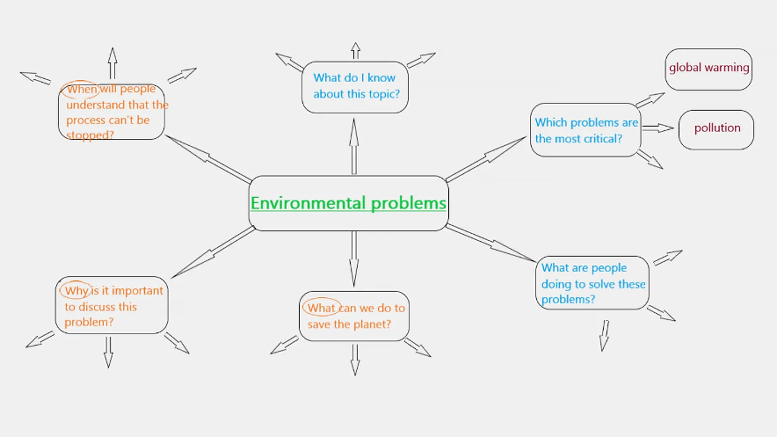 Если коротко, то суть в том, что учитель пишет в центре интеллект-карты тему и с одной стороны синим цветом проставляет важные вопросы, на которые учащиеся дают ответы, а с другой стороны рыжим цветом пишет только вопросительные слова, но вот сами вопросы с этими словами, связанными с темой, должны придумать уже сами ученики — и тоже найти ответы. То есть благодаря этому и тема прорабатывается глубоко, и получается такое интеллектуальное приключение.