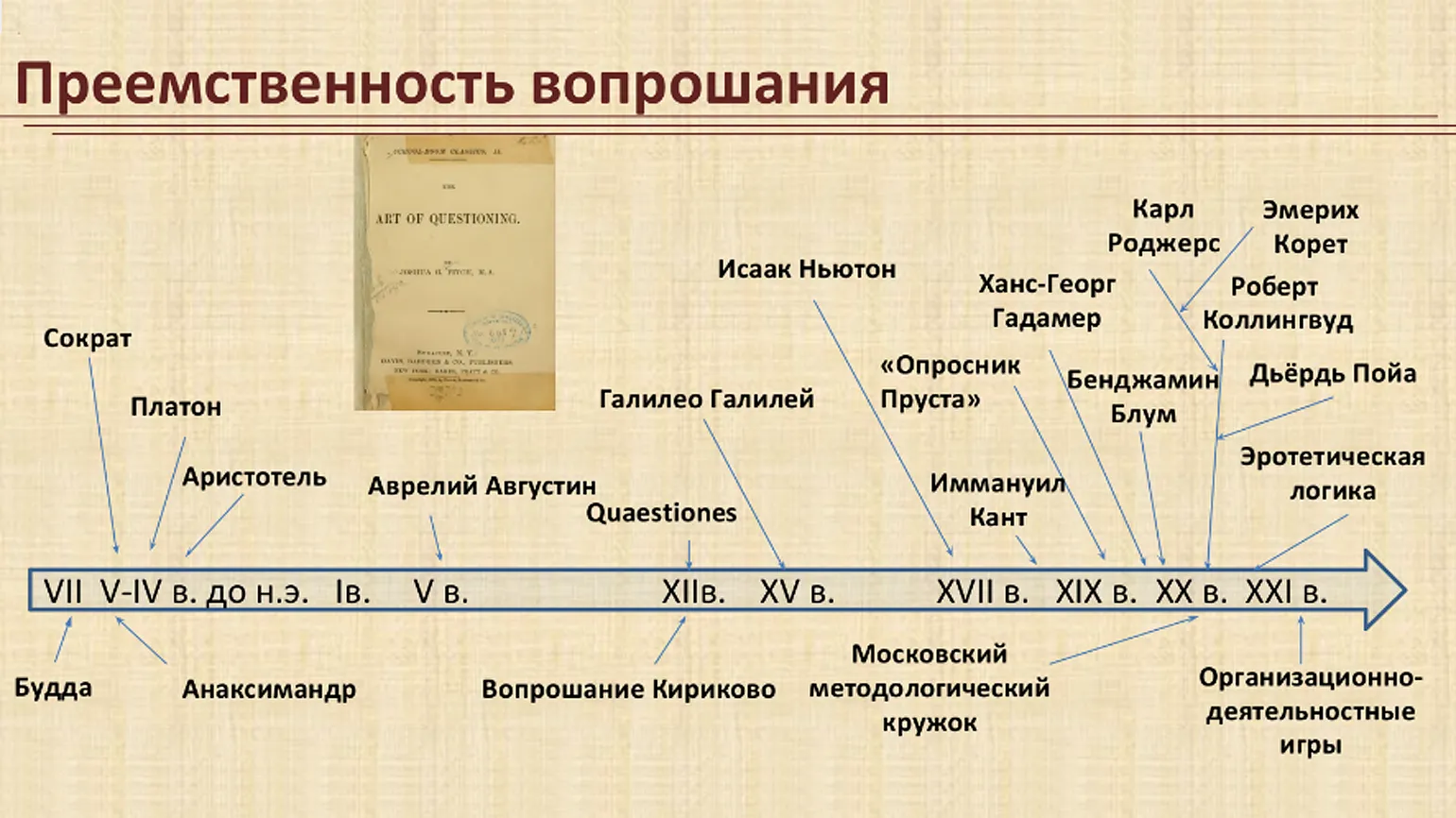 — На вебинарах про вопрошание я показываю слайд, где изображена историческая преемственность в подходах к вопрошанию. На этой карте много имён, так что нельзя назвать какого-то конкретного человека, который взял и придумал вопрошание. Многие люди им занимались так или иначе.