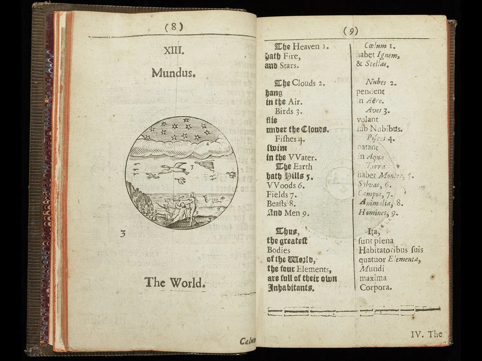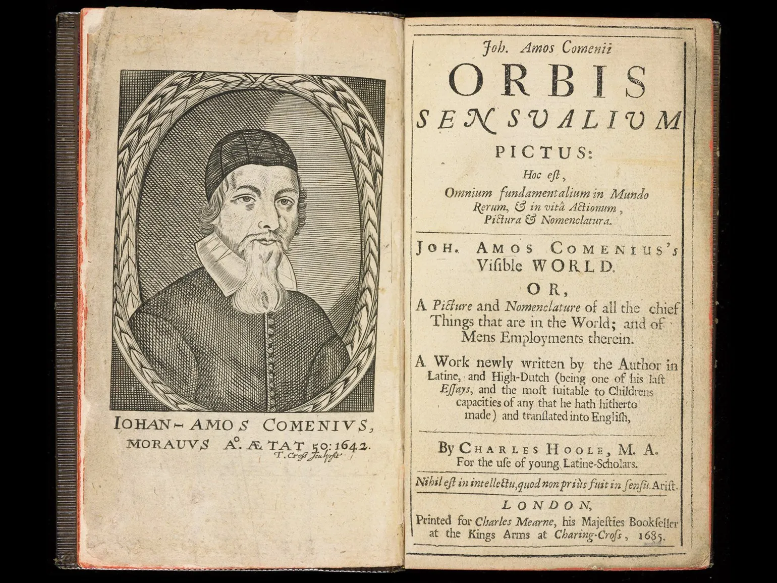 Следуя этому принципу, он сам написал и проиллюстрировал наглядный учебник — «Чувственный мир в картинках». Это была книга для обучения детей чтению и одновременно для знакомства с окружающим миром. Кроме этого, Коменский составил ещё несколько учебников — по физике, астрономии и пособие по изучению языков (он сам преподавал латынь).
