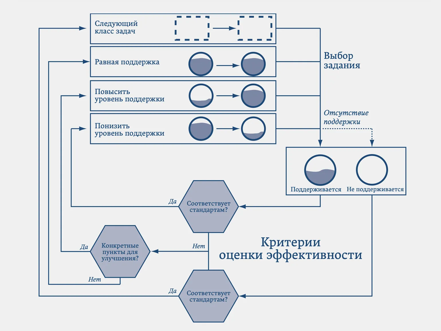 - Если выполнение учебных задач с поддержкой соответствует не всем стандартам приемлемого выполнения, то учащийся переходит либо к учебной задаче с тем же уровнем поддержки и (или) руководства, либо к учебной задаче с более высоким уровнем целевой поддержки и (или) руководства.