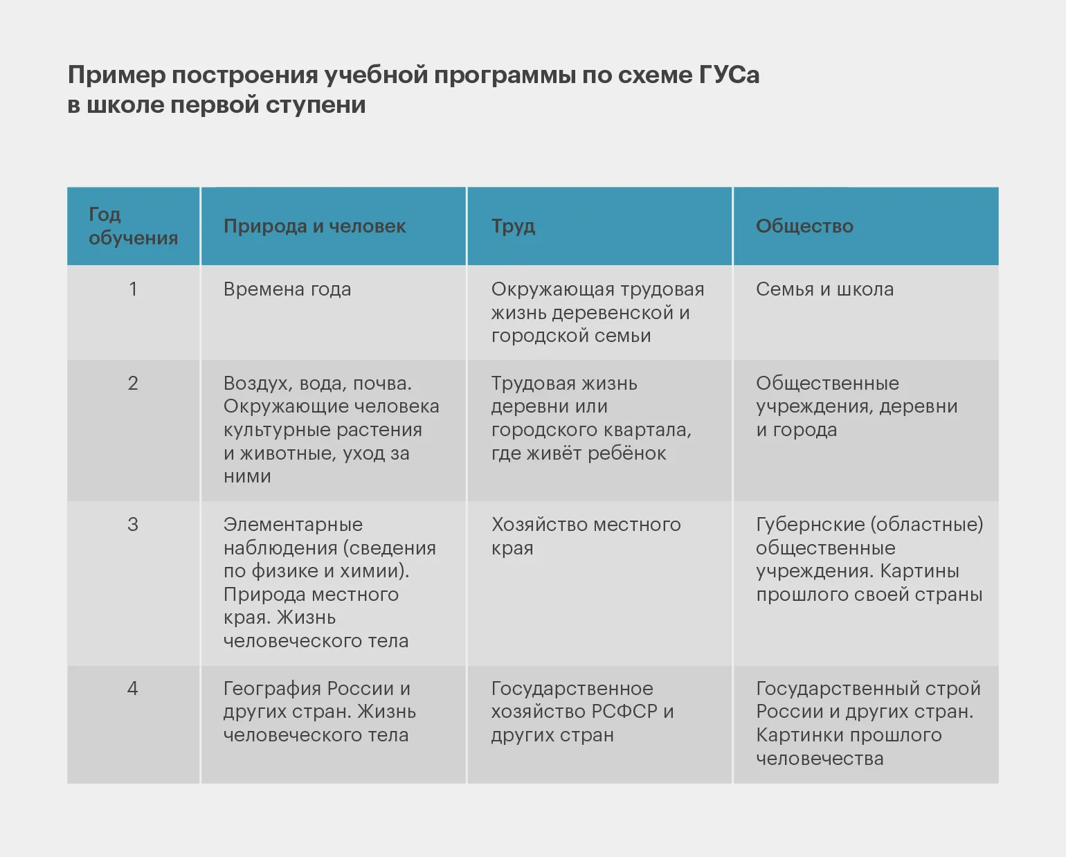 К концу 1922 года на основе комплексного принципа составили программу для школ первой ступени, то есть начальной, а в 1923 году — для полной семилетней. Они получили название «схемы ГУСа» и фактически отменяли разделение на предметы. Вместо отдельных дисциплин вводились комплексы — темы из разных предметов, объединяющиеся вокруг одного явления. Можно сказать, в советских школах вводился межпредметный подход.