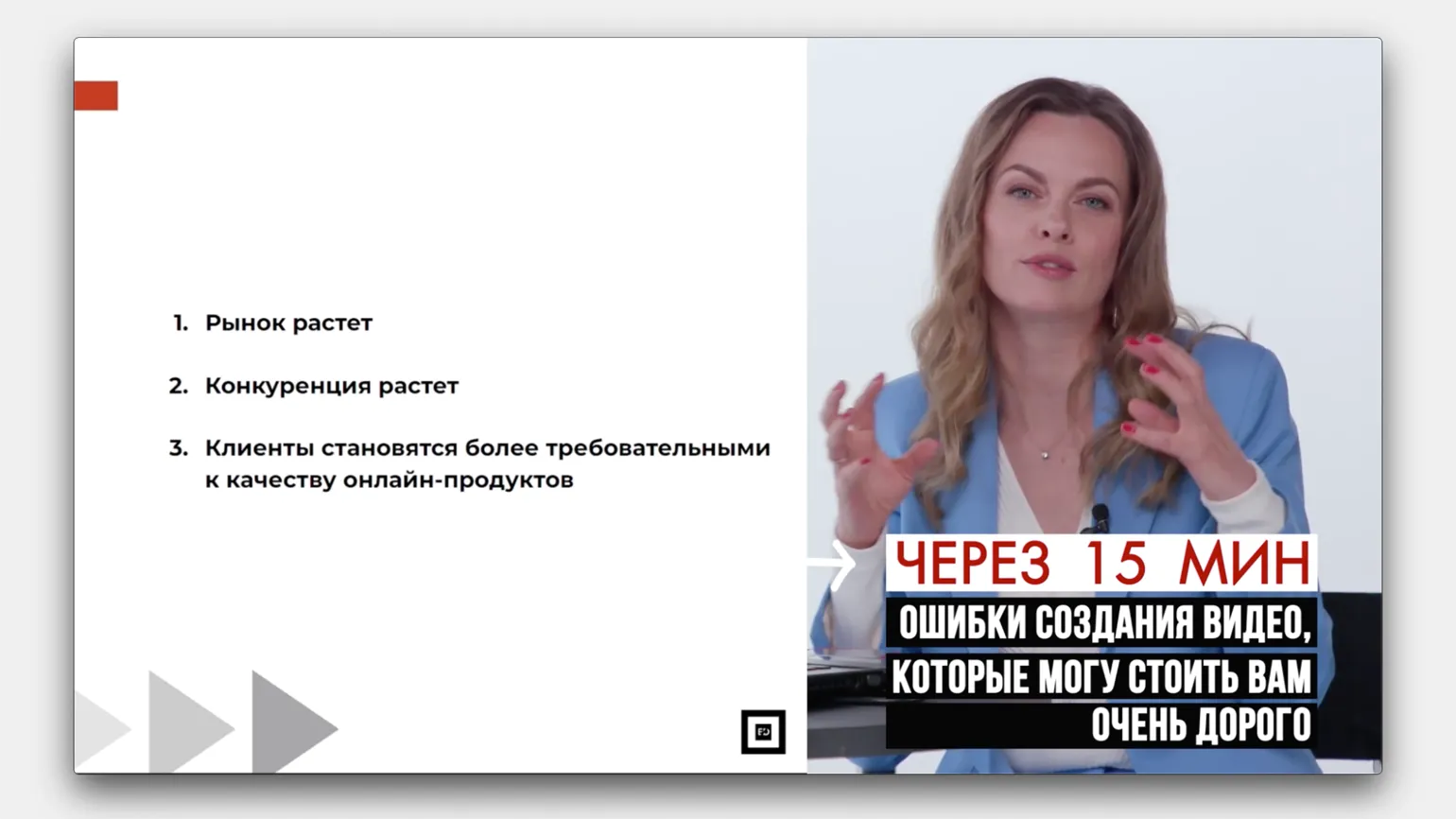 Продукт и его реклама должны соответствовать друг другу по уровню. Продажа премиального курса на вебинаре, проведённом «на коленке», вызовет недоумение: «Если на вебинаре такая плохая картинка, то стоит ли курс своих денег?» И наоборот, если вебинар по качеству продакшена приближается к кино, это может отпугнуть аудиторию, которая ожидает формата попроще. Продажи онлайн-курса в обоих случаях будут ниже ожидаемых.