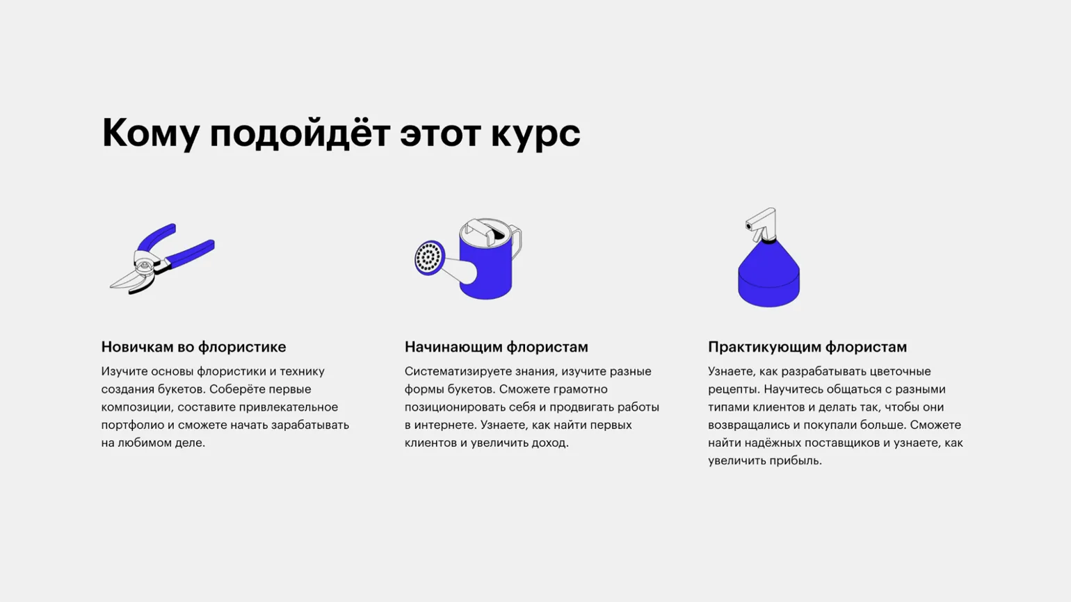 - Название и краткое описание курса, содержащее основную информацию о его целях. Например: «Курс „Флористика с нуля“. Вы научитесь составлять цветочные композиции, выбирать поставщиков и работать с клиентами так, чтобы они возвращались. Сможете устроиться в цветочный салон или запустить своё дело».