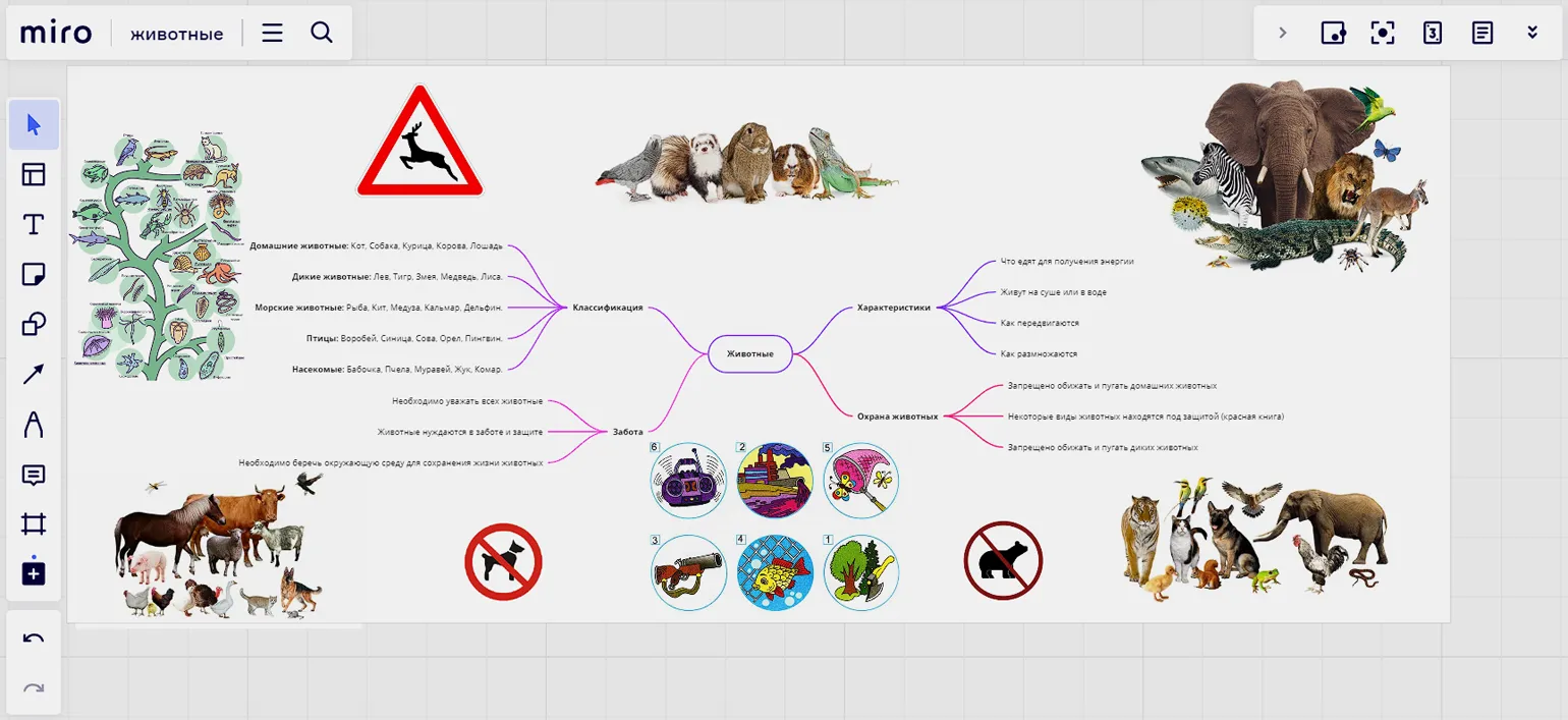 Хороший вариант — так называемые интеллект-карты. Это схемы, которые показывают связи между объектами или идеями, помогают структурировать информацию и отделять важное от второстепенного. В центр помещается основное понятие (допустим, «охрана природы»), от него отходят разноцветные веточки-понятия ― «переработка мусора», «экономия ресурсов». А от них ― второстепенные понятия, которые помогают раскрыть идею: «не бросать мусор на землю», «вовремя выключать свет». Таким образом можно структурировать любую информацию. А если рисовать интеллект-карту вместе с учениками, она может превратиться в целый образовательный проект. Это можно делать с помощью интерактивных онлайн-досок для совместной работы.