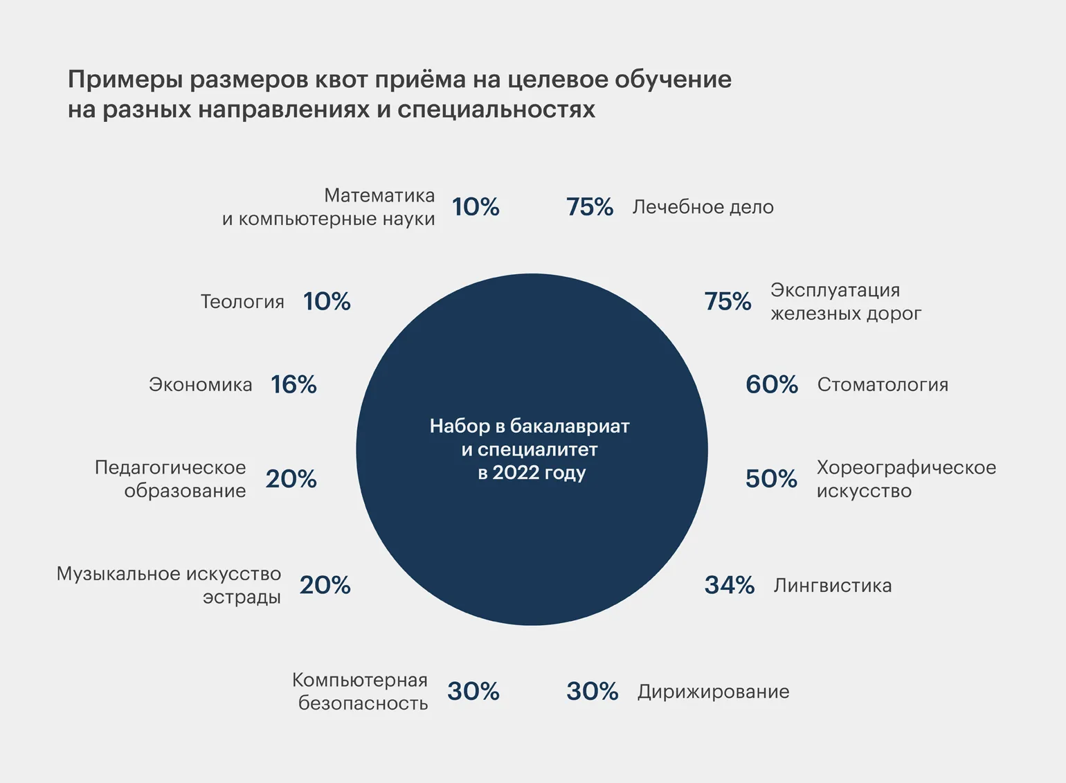 В законе говорится, что целевые квоты выделяются исходя из потребностей экономики в квалифицированных кадрах и отраслевых особенностей, но в реальности целевые места бывают практически на всех направлениях подготовки. Даже на якобы «избыточную» юриспруденцию, а также, казалось бы, не самые важные для экономики филологию, философию и теологию выделяются квоты по 10% бюджетных мест бакалавриата, на очень популярные у абитуриентов медиакоммуникации и дизайн — по 15 и 10%, на лингвистику и международные отношения — по 34–35%. Очень существенные доли выделяются на направления, связанные с искусством, — но возможно, это как раз «отраслевые особенности».