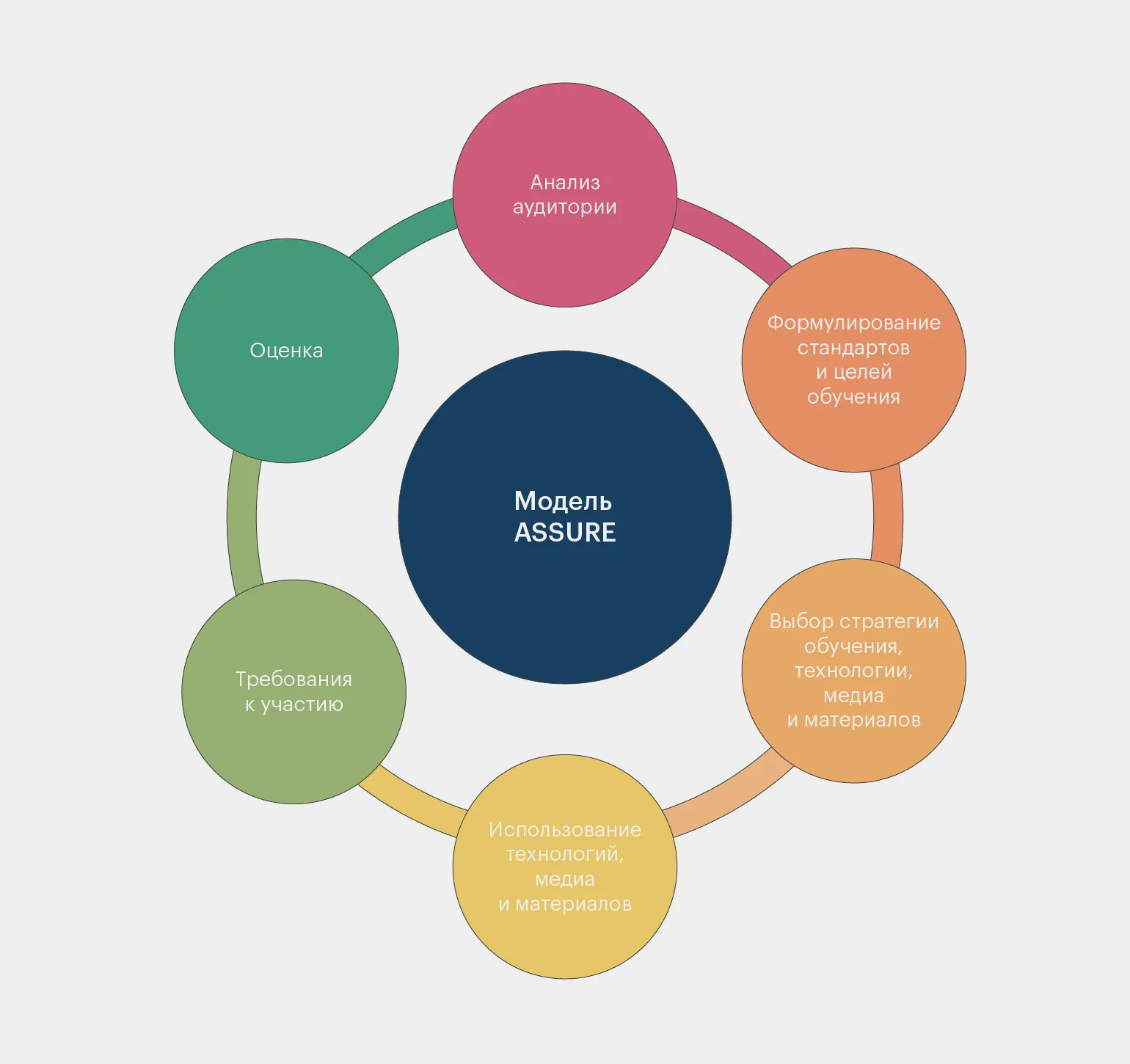Модель ASSURE похожа на ADDIE — она последовательно описывает комплексный процесс разработки учебной программы. Разница в том, что она учитывает профессиональные или государственные стандарты. Проще говоря, эта модель будет хороша для вузовских или корпоративных программ и не потребует адаптации, например, к ФГОС, как это обычно происходит с ADDIE.