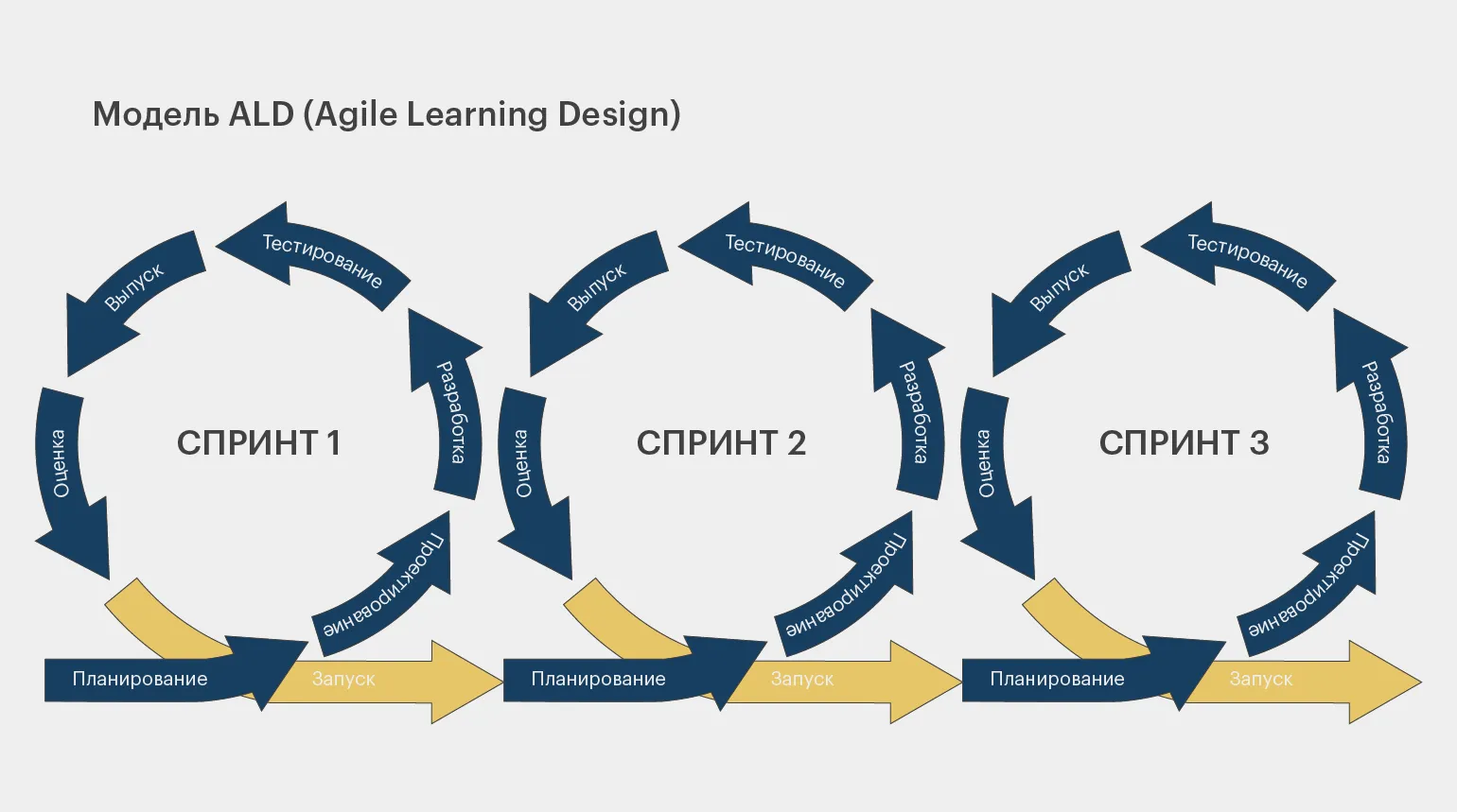 Модель ALD (Agile Learning Design) пришла в педдизайн из бизнес-сферы. Agile — это гибкий подход к разработке продукта, поэтому и модель отличается гибкостью и скоростью. Она идеальна в ситуациях, когда студентов нужно быстро привести к финальному результату.