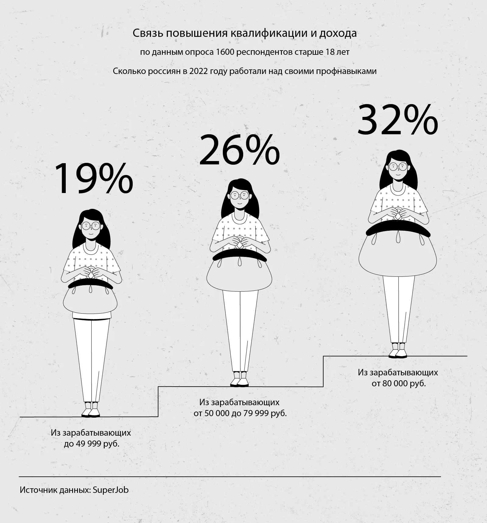 Рекрутинговая платформа SuperJob провела опрос среди экономически активных пользователей — им задали вопросы о том, над какими навыками они работали в 2022 году: профессиональными (хард-скиллами), навыками социального взаимодействия (софт-скиллами) или тем и другим. Оказалось, что профессиональным навыкам уделяли внимание 25%, социального взаимодействия — 12%. При этом доля тех, кто занимался навыками социального взаимодействия, оказалась больше всего среди более молодого сегмента (до 34 лет) — 16% — и меньше всего среди тех, кому старше 45 лет, — 10%. Что касается «прокачки» профессиональных навыков (хард‑скиллов), то значимой разницы в зависимости от возраста не обнаружено. Зато заметна зависимость от уровня дохода: среди респондентов с более высокими доходами было больше тех, кто развивал свои профессиональные навыки.