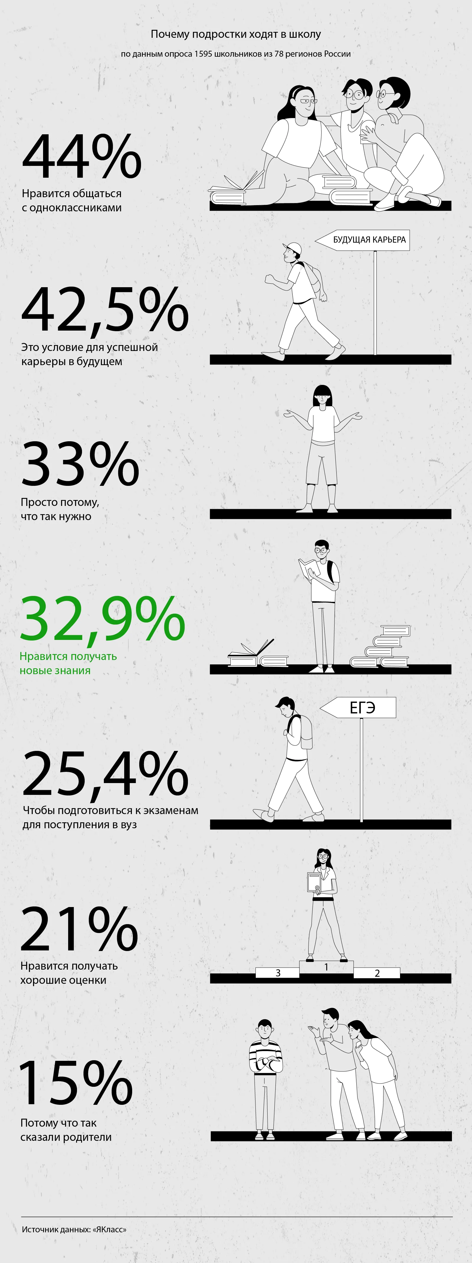 Международная образовательная компания «ЯКласс» в ноябре 2022 года провела опрос среди учеников 5–11 классов, чтобы выяснить их отношение к учёбе в школе. Среди прочего, у них поинтересовались, что мотивирует их ходить в школу. Вот какие ответы были получены.