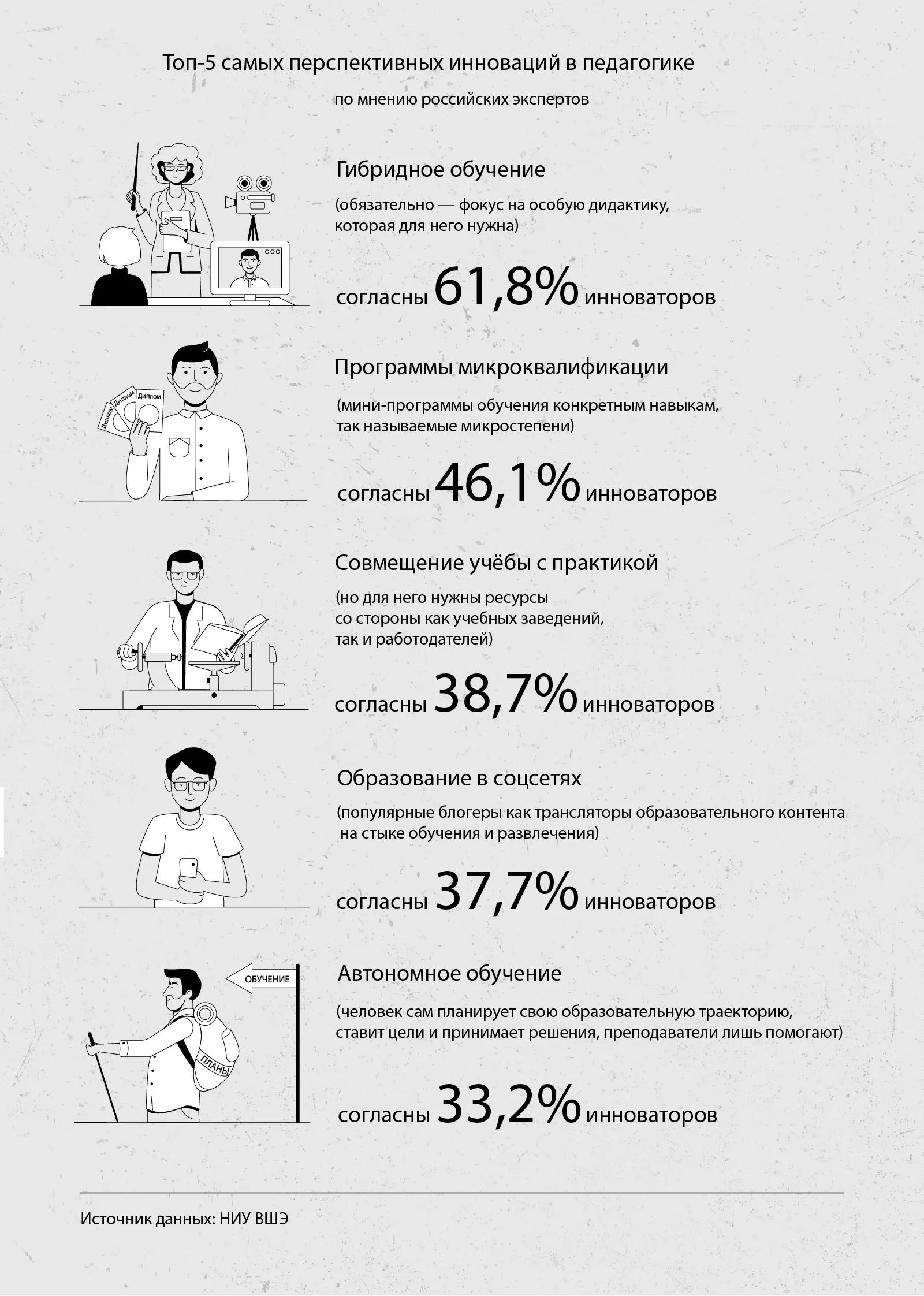 Ежегодно группа учёных Института образовательных технологий Открытого университета в Великобритании выпускает публичный доклад Innovative Pedagogy. В нём собирают образовательные тренды, которые влияют на сферу образования, но ещё не получили широкое распространение. В свою очередь, Институт образования НИУ ВШЭ ежегодно опрашивает российских экспертов, студентов и школьников, какие из десяти отмеченных мировых трендов в России уже применяются, у каких есть потенциал, а какие для нас менее актуальны.