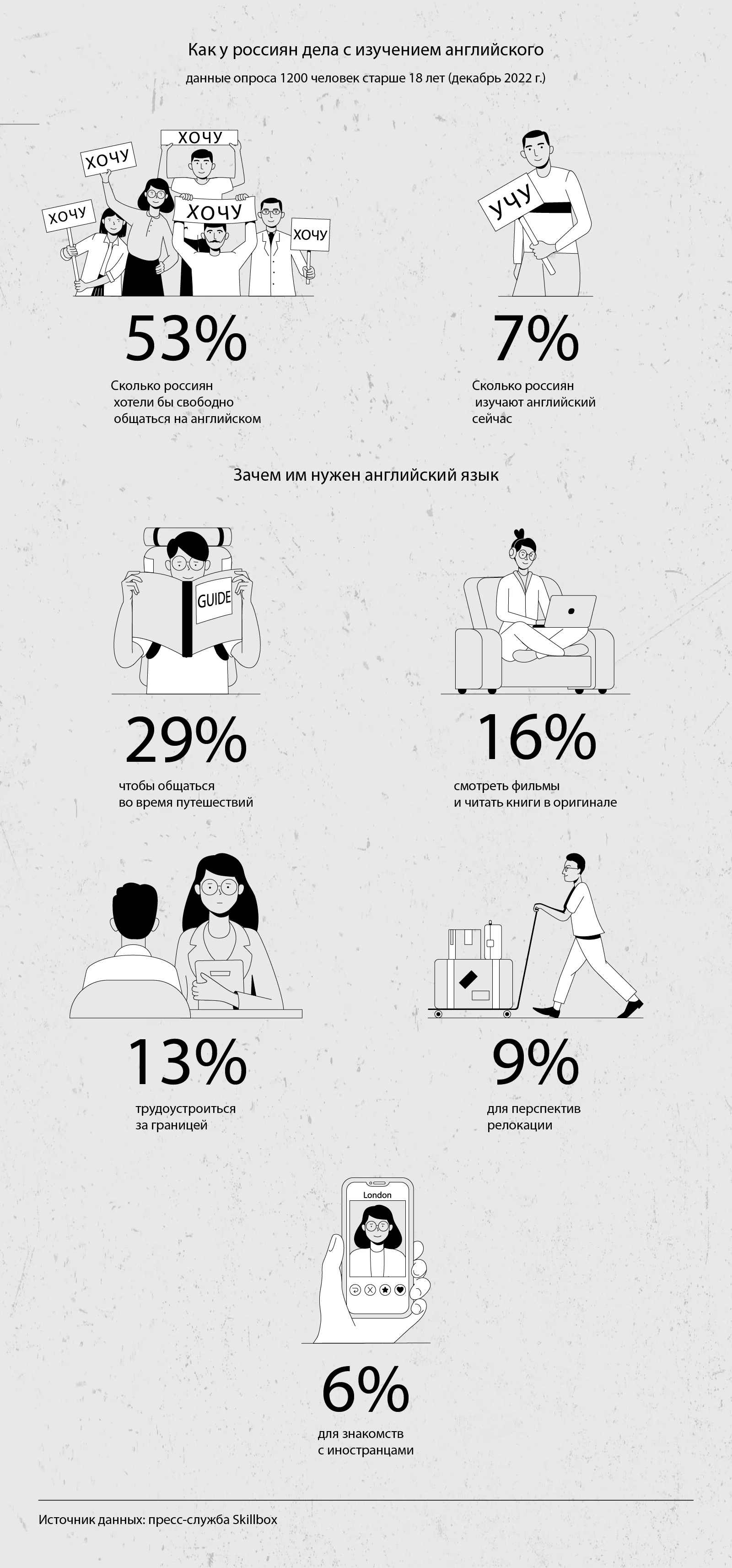 Направление «Английский язык» в Skillbox совместно с командой исследований VK выяснили, как и для чего россияне изучают английский. В опросе приняли участие 1200 респондентов по всей стране в возрасте от 18 лет. Из всех участников опроса, которые когда-либо учили или сейчас изучают английский, 6% оценили свой навык как «свободное владение». Треть респондентов признались, что обладают лишь обрывочными знаниями (33%), а четверть (24%) владеют только письменными навыками, но плохо воспринимают английскую речь на слух и испытывают сложности в поддержании разговора. Трудности в изучении языка, с которыми чаще всего сталкиваются опрошенные, — это в равной степени отсутствие разговорной практики (21%) и проблемы с запоминанием слов, разных форм, конструкций времён и грамматики (21%).