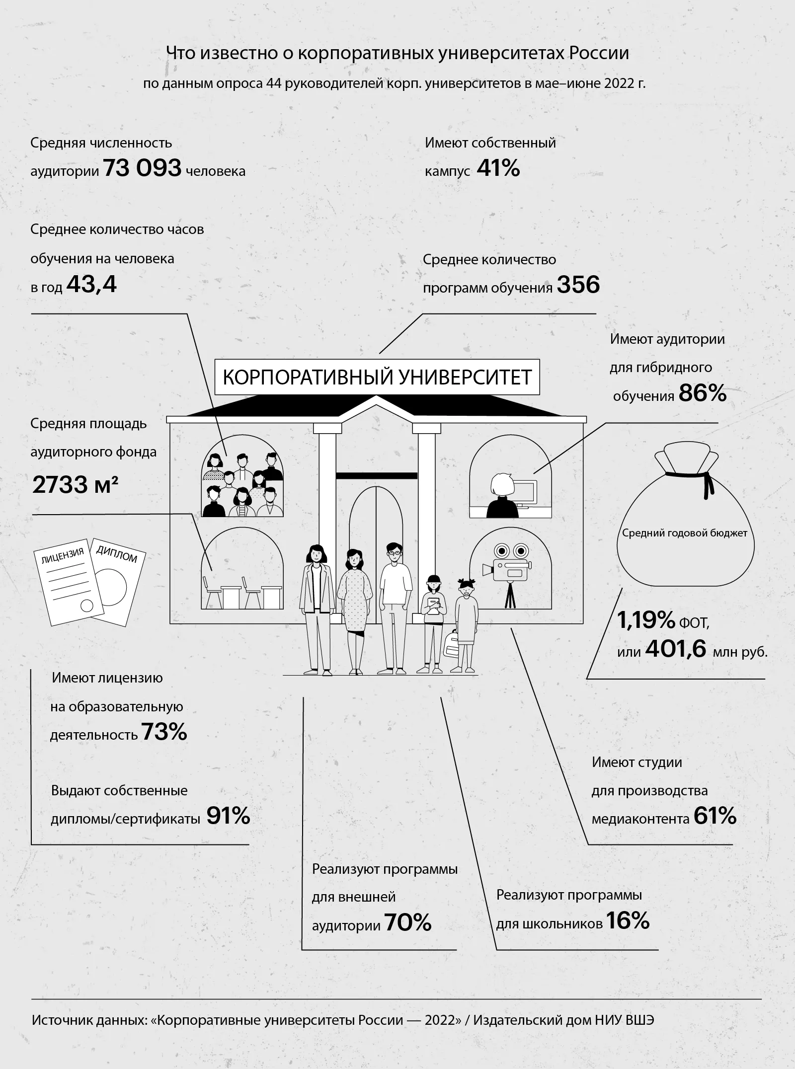 Сбор данных для этого исследования провели в мае-июне 2022 года в формате анкетирования. Его прошли 44 руководителя корпоративных университетов компаний из рейтинга «Эксперт-200». Они ответили на вопросы о своих образовательных программах, целевой аудитории, бюджете, организационном устройстве и ключевых показателях эффективности — по данным 2021 года. Даже из самых общих цифр, представленных на приведённой ниже инфографике, видно, насколько это мощный сегмент.