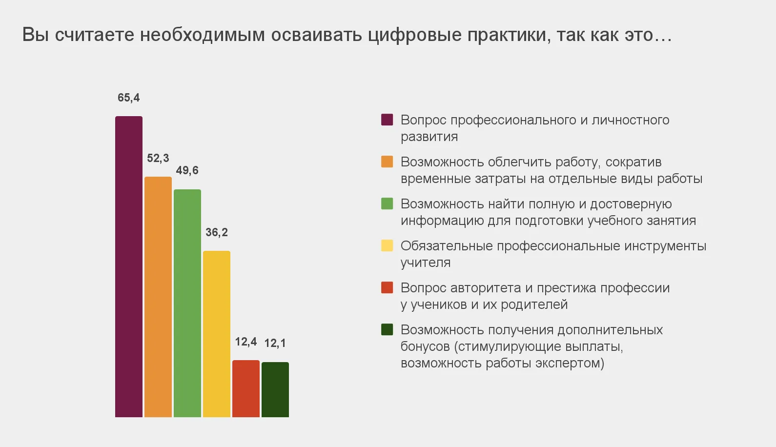 В этом контексте примечателен и другой показатель: только 12% респондентов сказали, что осваивают цифровые практики ради «бонусов», например, стимулирующих выплат. Ольга Суханова объясняет: это также может говорить об осознанности педагогического сообщества в целом — «принудиловка» или финансовые выгоды учителей не вдохновляют.