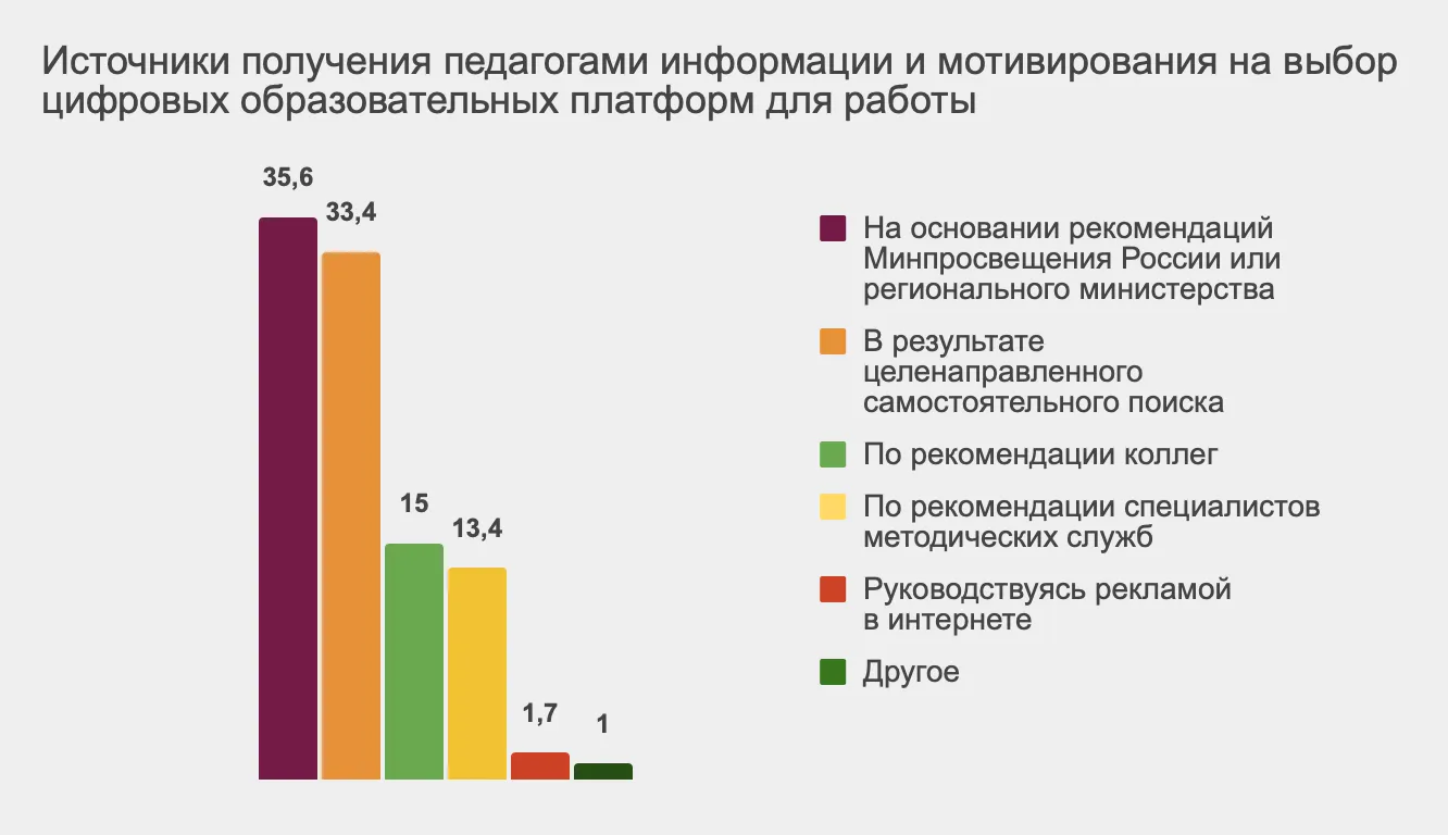 Другой вопрос — о рекомендациях цифровых платформ — показал, что лишь 15% педагогов прислушаются к мнению коллег при выборе подходящих инструментов для работы. Это достаточно низкий уровень доверия, особенно в сравнении с тем, которое педагоги демонстрируют по отношению к Министерству просвещения.