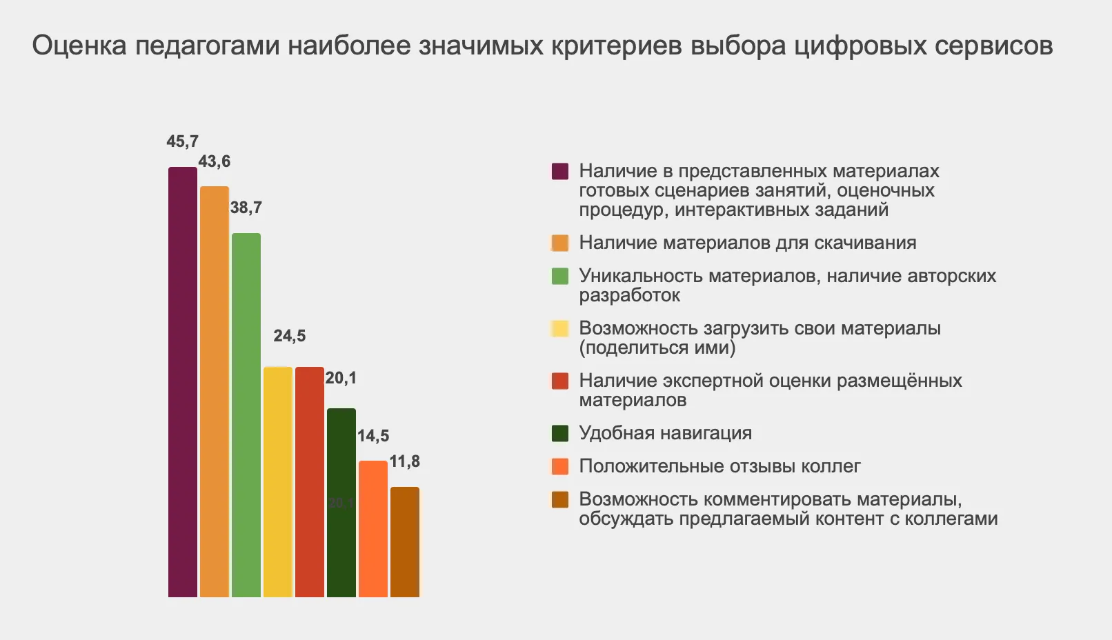 Судя по результатам опроса, педагогам важны и другие критерии при выборе сервисов. Например, почти 40% респондентов ищут «уникальные материалы» и авторские разработки. Хотя организаторы исследования не поясняют, что под этим подразумевается, можно сделать предположение, что учителя ищут выверенный и интересный контент для занятий.