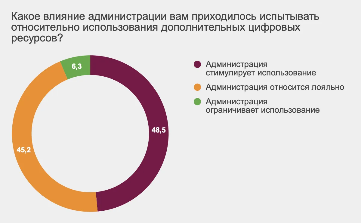 Однако дело не только в гаджетах. Например, 6% респондентов рассказали, что администрация школы вообще ограничивает использование цифровых средств в работе. Ольгу Суханову такой показатель удивил — она была уверена, что он будет равен нулю.