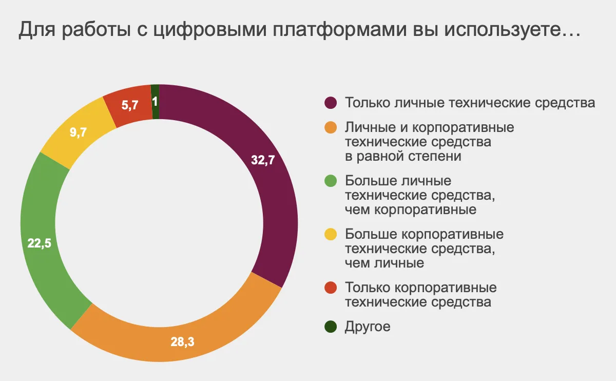 К слову, в основном педагогам приходится использовать либо только собственные гаджеты в работе, либо преимущественно собственные. Около трети опрошенных сказали, что им в равной степени доступны и свои технические средства, и принадлежащие школе.