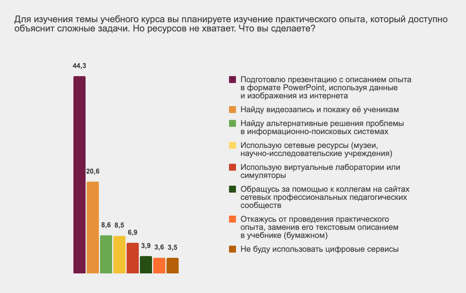 Второй по популярности ответ — показать видео эксперимента. То есть в обоих случаях учителя планируют воспользоваться самыми простыми и экономящими время средствами.