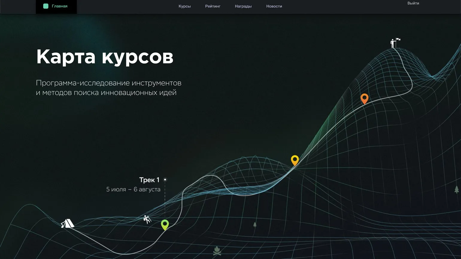 А что, если исправить ситуацию и в прямом смысле показать ему прогресс? Например, когда мы разрабатывали платформу для проекта «Сбера» «Лидеры идей», то представили серию курсов как подъём в гору. Пользователи платформы — создатели инновационных проектов — проходят три этапа. Каждый — это более высокий уровень навыков и знаний, и по мере прохождения компетентность участников растёт. На такой карте курсов человек видит свой прогресс, траекторию развития и конечную цель.