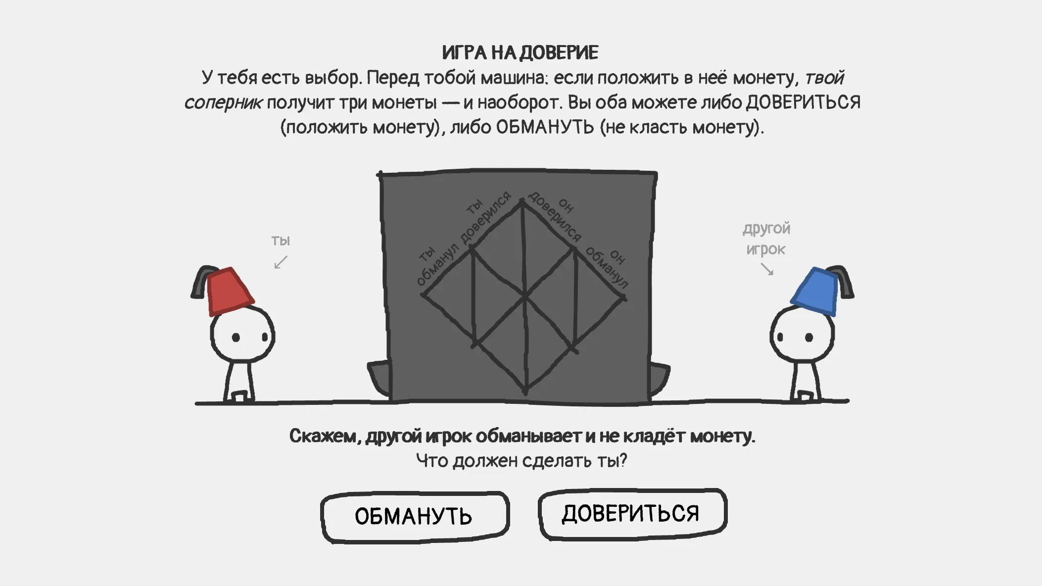 Другой пример: международный социальный проект «Эволюция доверия». Там с помощью теории игр объясняют, как люди взаимодействуют, принимают решения о кооперации или соперничестве. Пользователь играет от лица мини-человечка: ему нужно заработать как можно больше монеток в специальном автомате, а выигрыш зависит от степени доверия к противнику по игре. Противники — это стереотипные герои (например, имитатор, обманщик и детектив-аналитик).
