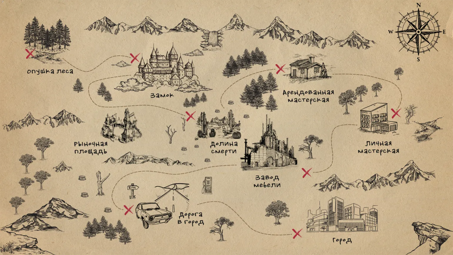 Кстати, такой же приём можно использовать и с базой знаний, когда вместо единой траектории есть множество разрозненных тем. Например, базу знаний акселератора для молодых предпринимателей Pre.Inc мы представили в виде интерактивной кастомной карты. Визуально курс стилизован под путешествие: фоны видео отражают локации, а спикеры играют роли проводника и случайных попутчиков.