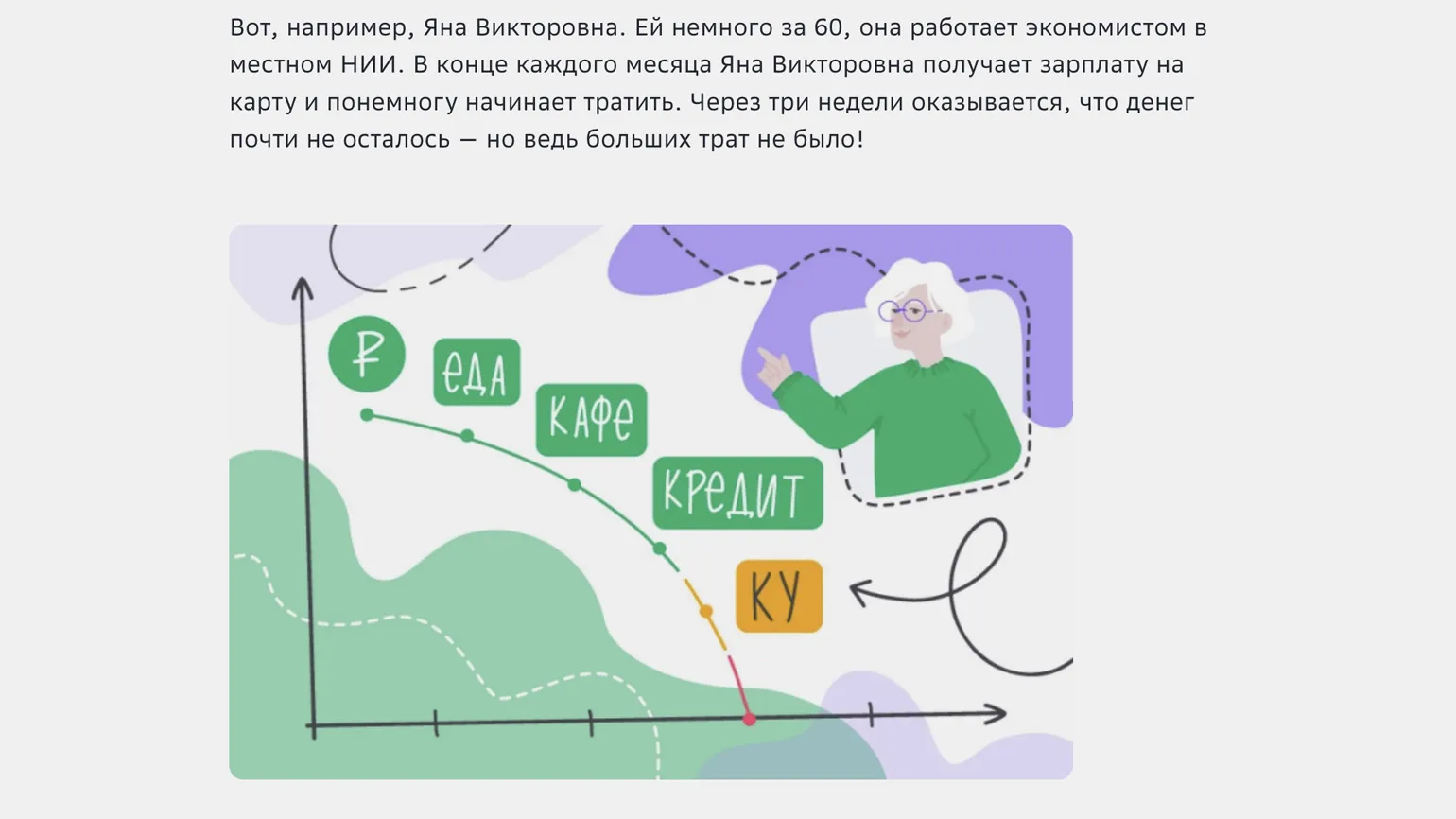 Например, таким приёмом мы воспользовались в создании «Школы цифровых навыков». Проект предназначен для людей старшего и пожилого возраста: с помощью уроков в текстовом формате им объясняют, как делать покупки онлайн, контролировать расходы или искать работу. Но вместо стандартной, сухой инструкции каждый урок включает небольшую историю о 60-летнем экономисте из НИИ Яне Викторовне. С ней происходят знакомые читателям ситуации: например, поиск лекарств по аптекам, финансовые проблемы перед зарплатой и так далее. С помощью теоретической информации урока героиня справляется со сложностями.