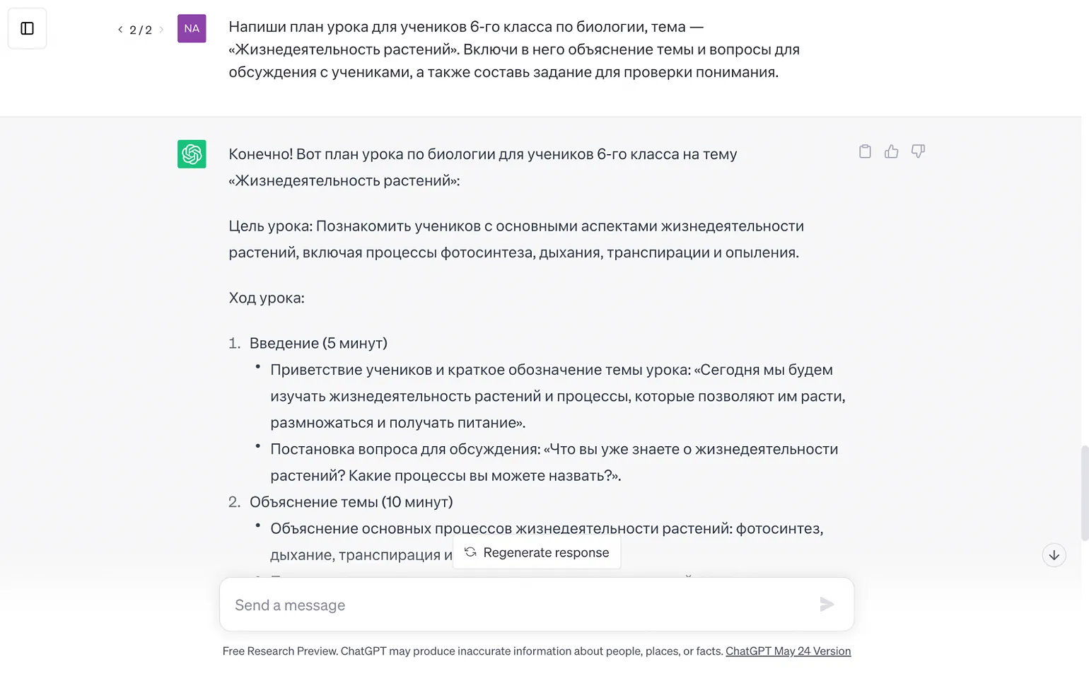 К любому запросу можно добавить готовый пример ― например, скопированный из интернета план похожего урока, чтобы нейросеть поняла, что от неё требуется. Для этого достаточно описать задачу, добавить в конце: «Используй вот этот текст в качестве примера» — и вставить подходящий образец.