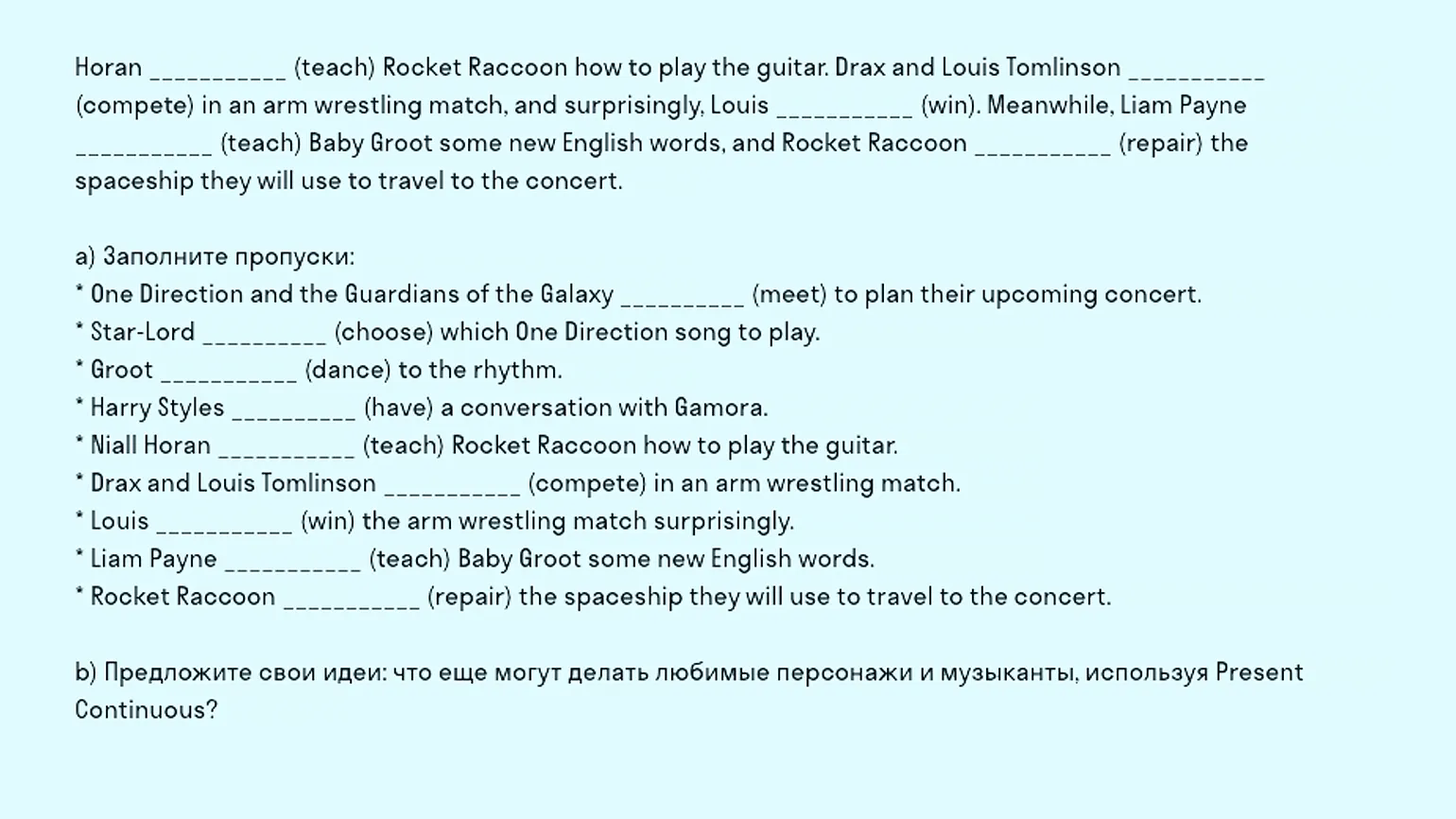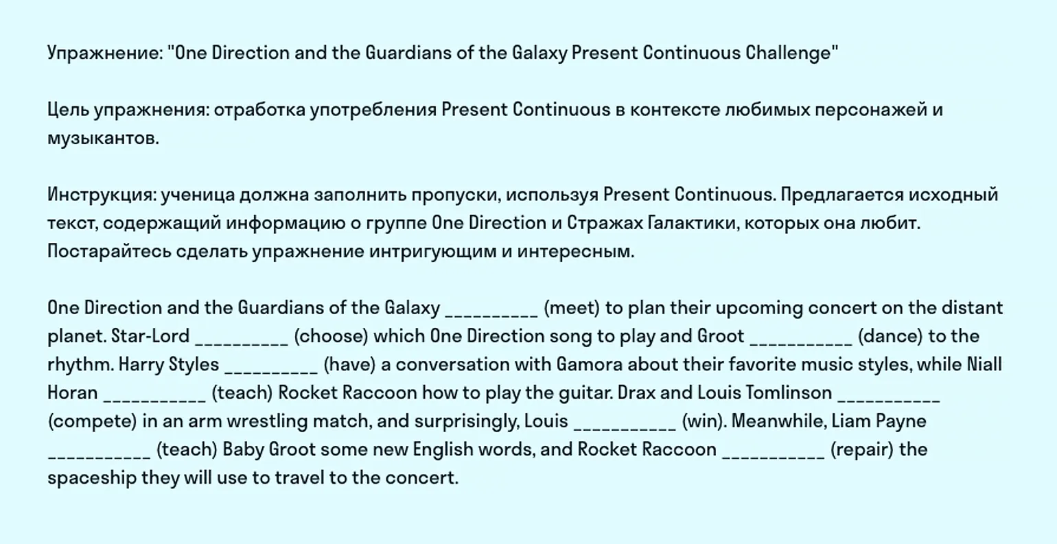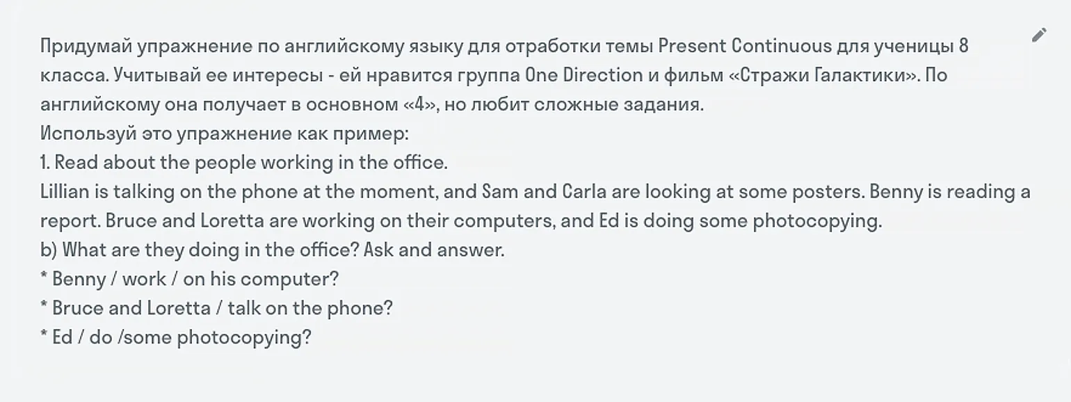 На скриншоте ниже нейросеть попросили придумать упражнение по английскому с учётом увлечений девочки-подростка. А чтобы нейросеть точно поняла нас, мы дали ей пример.