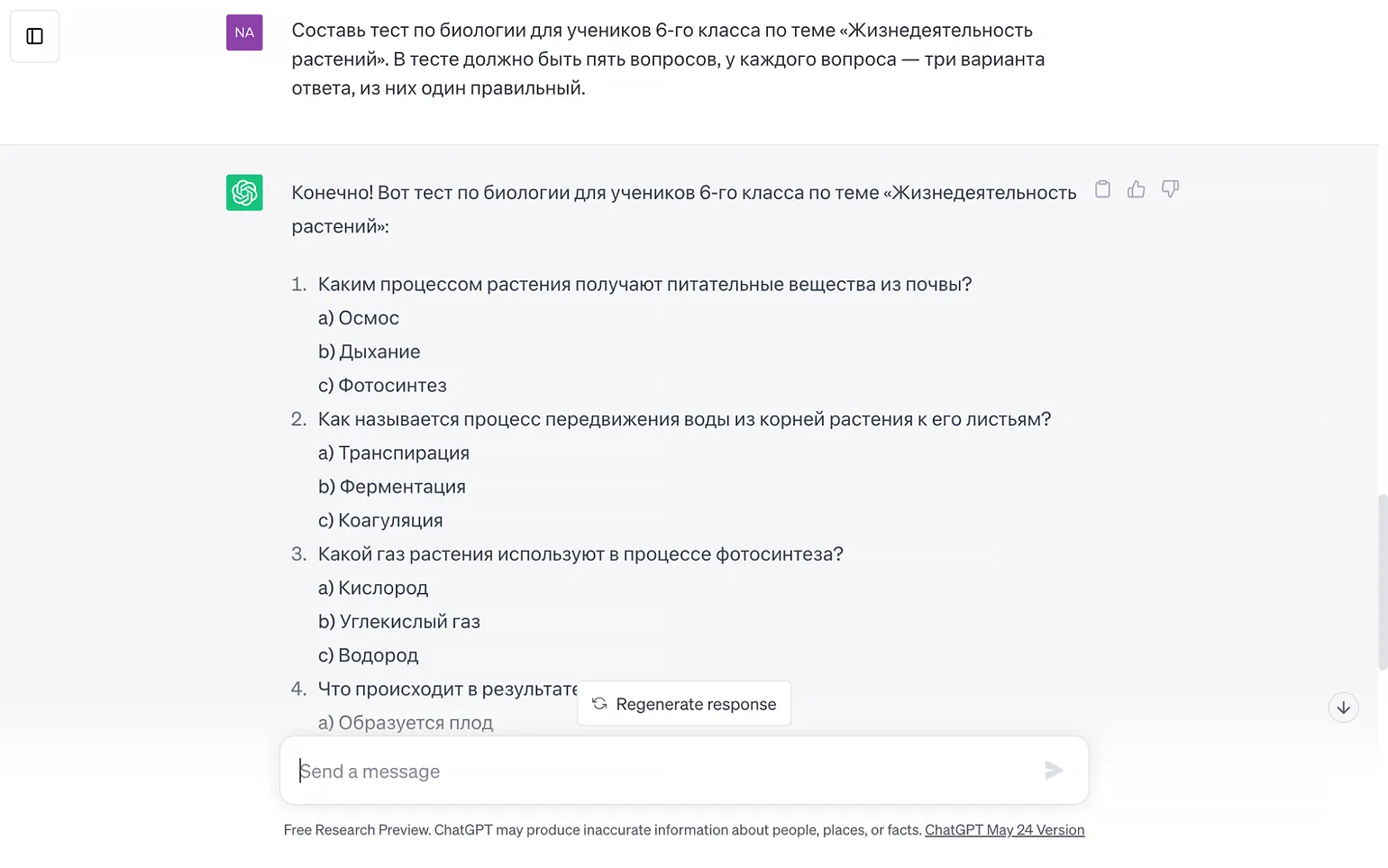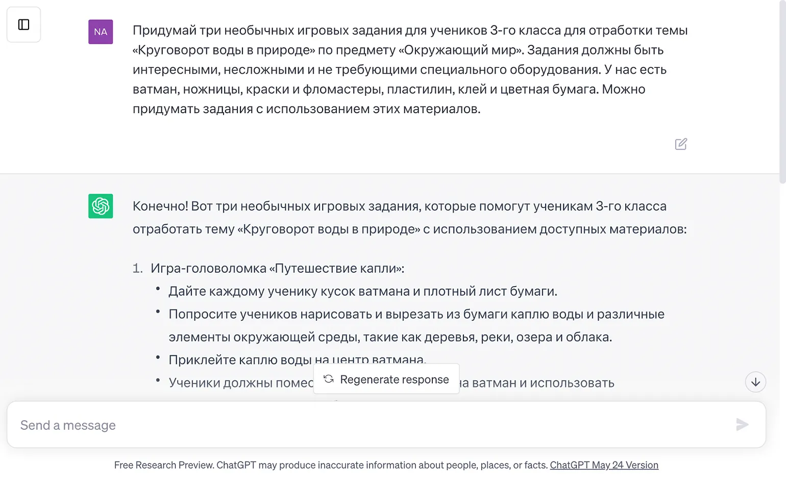 ChatGPT может и сам генерировать интересные идеи для заданий. Он не всегда справляется идеально, иногда приходится формулировать запрос несколько раз, но всё равно в итоге можно получить несколько приемлемых вариантов. К тому же, если в целом направление ответа верное, можно получить от ИИ другие идеи, нажав на кнопку Regenerate response или «Сгенерировать заново».