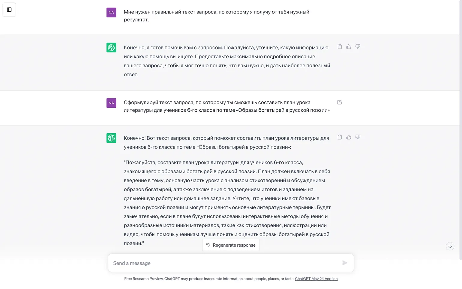 Если не знаете, как сформулировать промпт, можно попросить ChatGPT составить подробный и корректный запрос для себя самого. Для начала стоит обозначить задачу: «Мне нужен правильный текст запроса, по которому я получу от тебя нужный результат». ИИ ответит, что готов помочь, и попросит уточнить цель и тему запроса. Теперь можно переходить к конкретике: «Сформулируй текст запроса, по которому ты сможешь составить план урока литературы для учеников 6-го класса по теме „Образы богатырей в русской поэзии“». Полученный промпт можно подкорректировать на своё усмотрение и использовать для запроса.