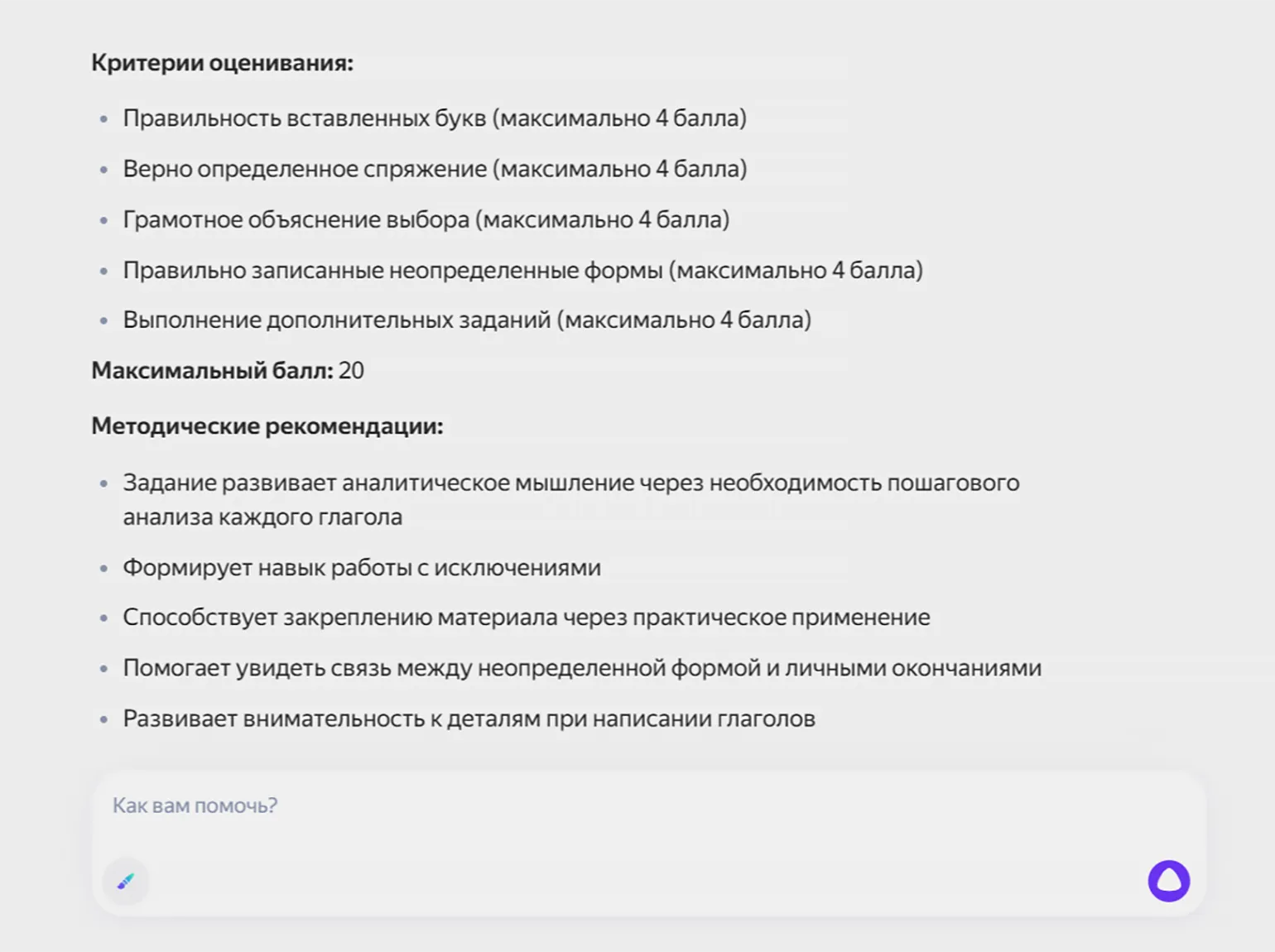 Вот какой ответ получился по этому промпту. Мы видим, что теперь нейросеть предлагает более разнообразные вопросы и чётко прописывает формулировки, в конце выдаёт даже методические рекомендации по заданному запросу. Правда, не обошлось и без галлюцинирования: в варианте ответа «а» задания №1 нейросеть привела несуществующее слово «летяют». Это ещё один пример того, почему педагогу важно вычитывать все получившиеся результаты. К слову, по наблюдениям эксперта, в заданиях по русскому языку нейросети чаще всего допускают ошибки в ответах.